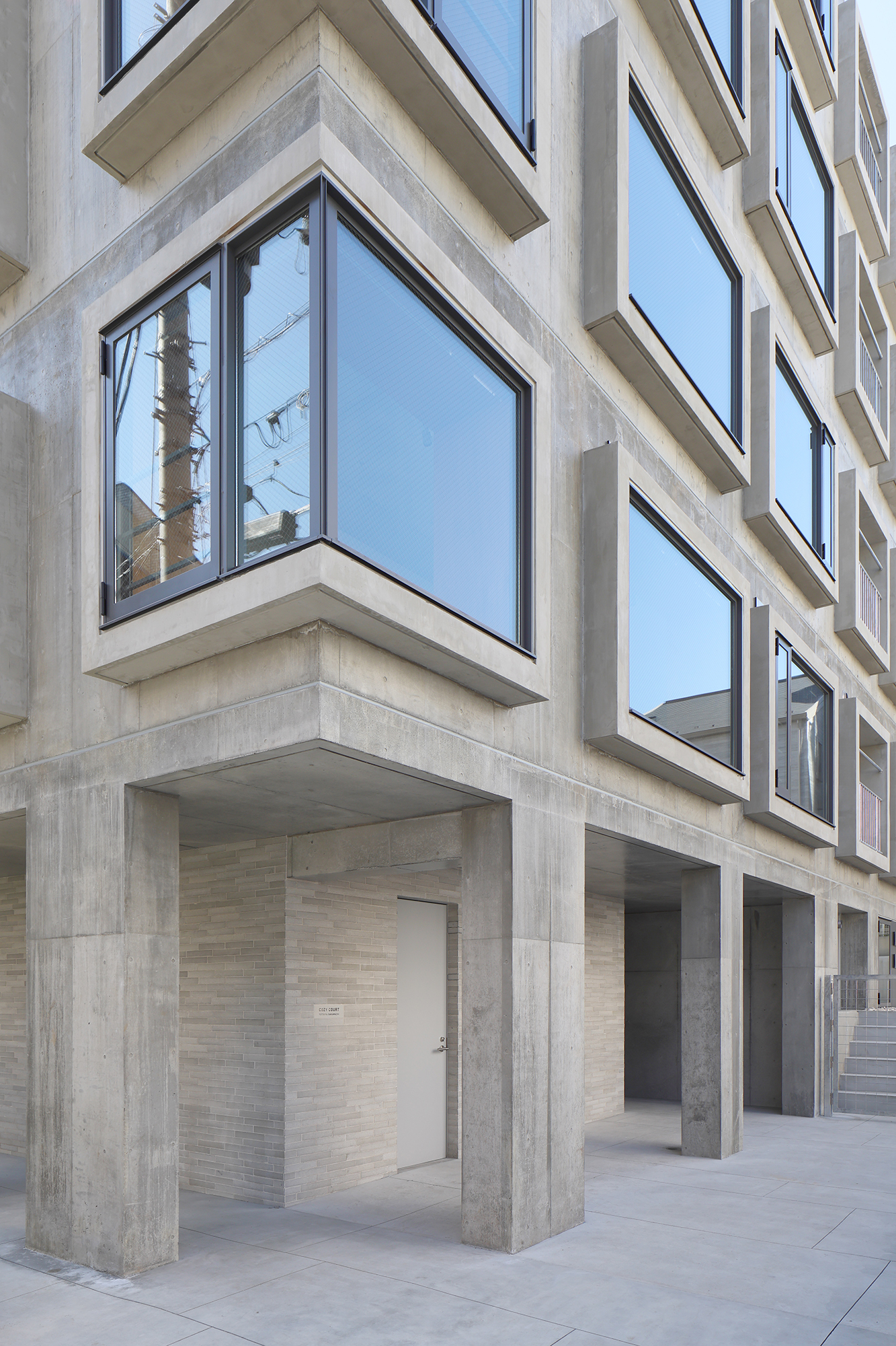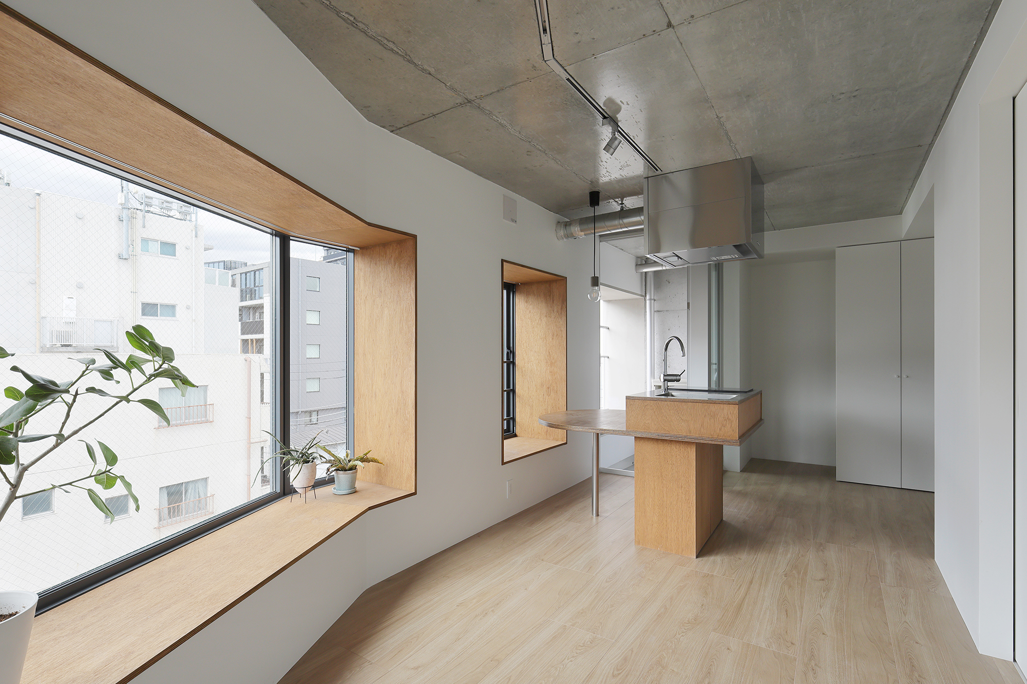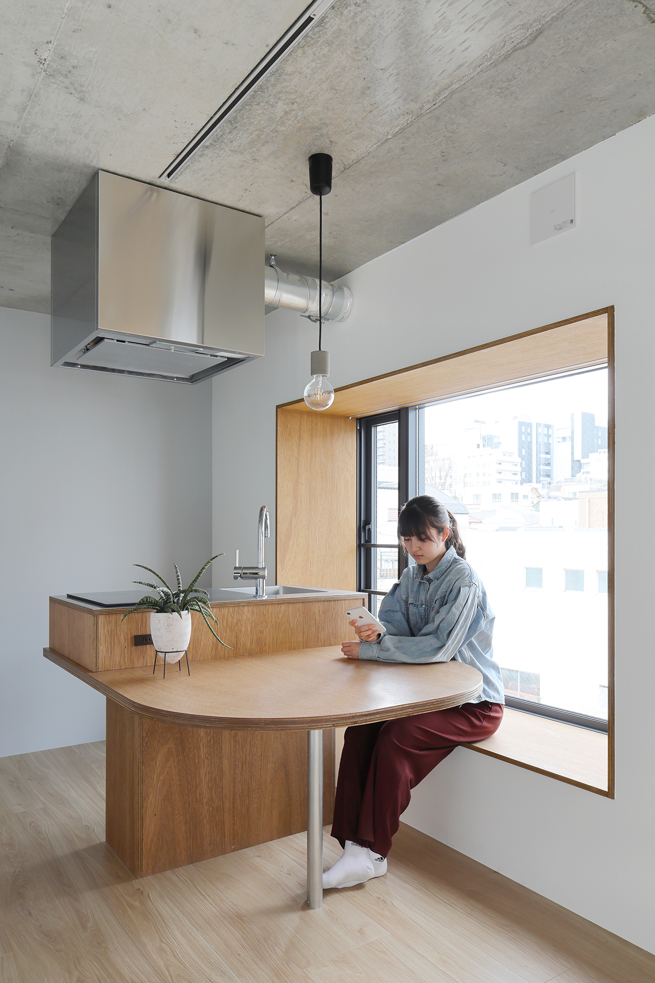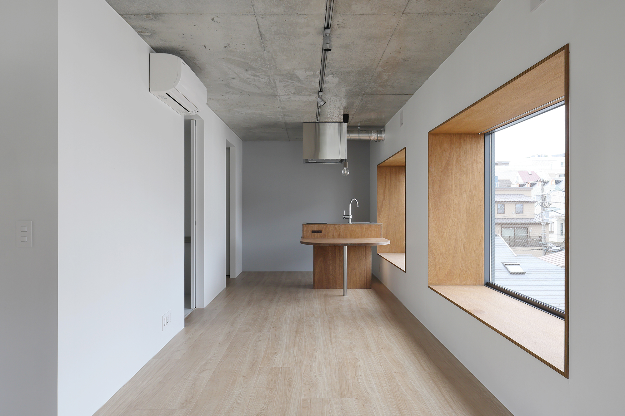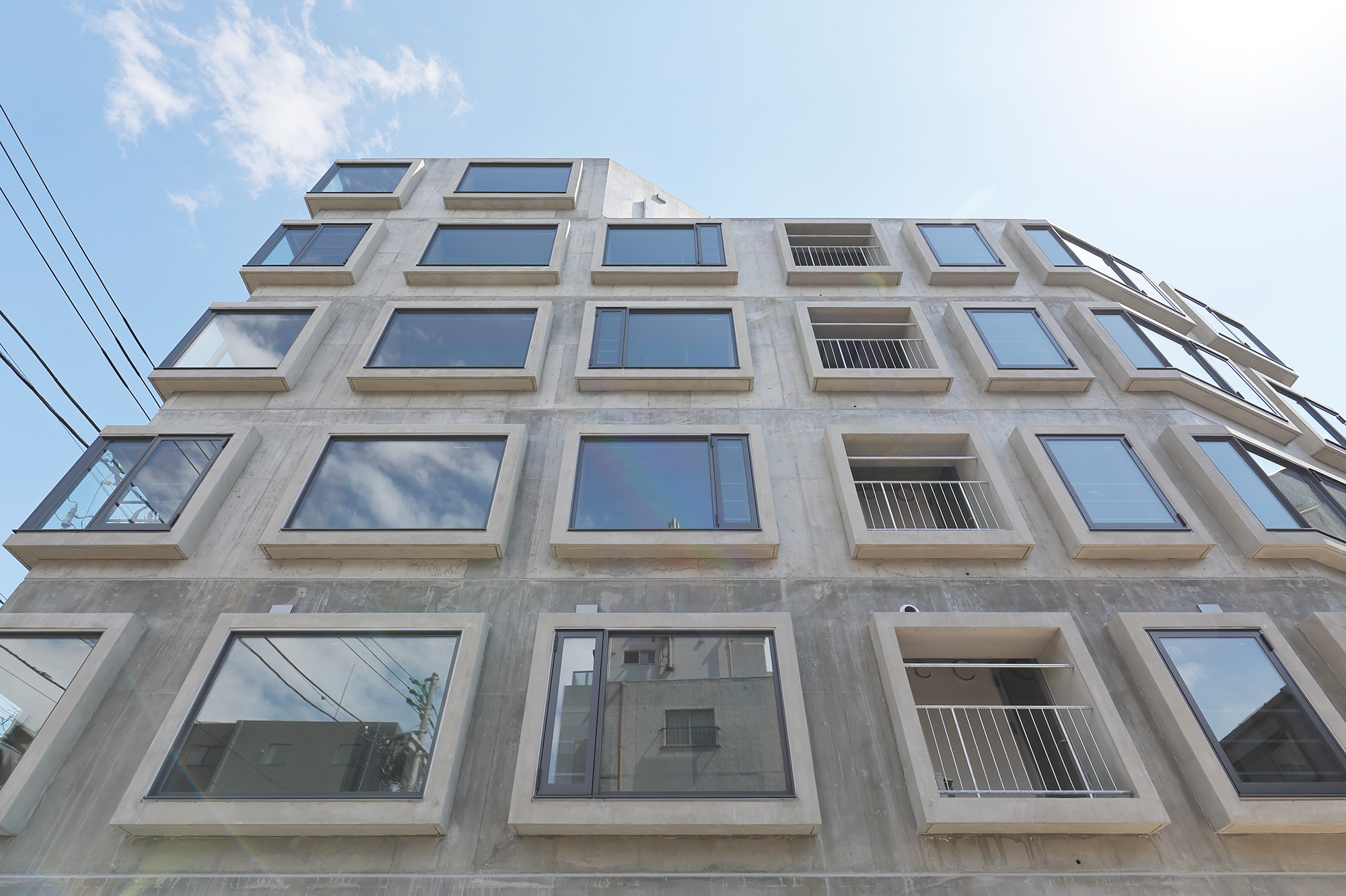 外壁は、柱・梁以外をすべて開口部とし、その縁をわずかに外に伸ばすことで奥行の深いゆったりとこしかけることのできる窓とした。「こしかけ窓」と名付けたこれらの窓は、ベンチやサイドボードなど多用途に使うことが可能であり、少ない家具で住み始める単身者にとって生活の手掛かりとなる。窓に奥行きがあることでダイニング、リビング、寝室など、ワンルームの中に複数の生活領域をつくりだす。各戸のテラスにも同形状の奥行と開口を持たせることで、住戸の境が一見分からない、全周に凹凸のある外観が生まれた。
