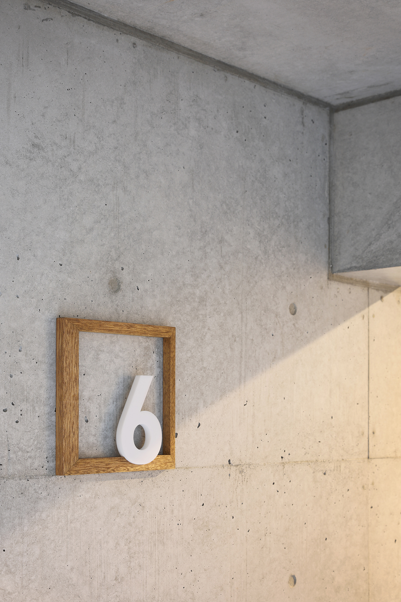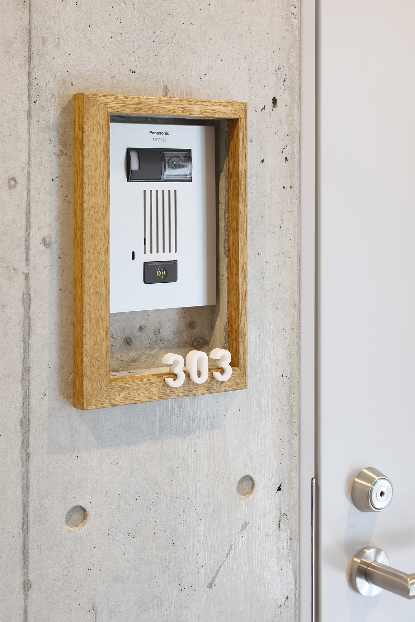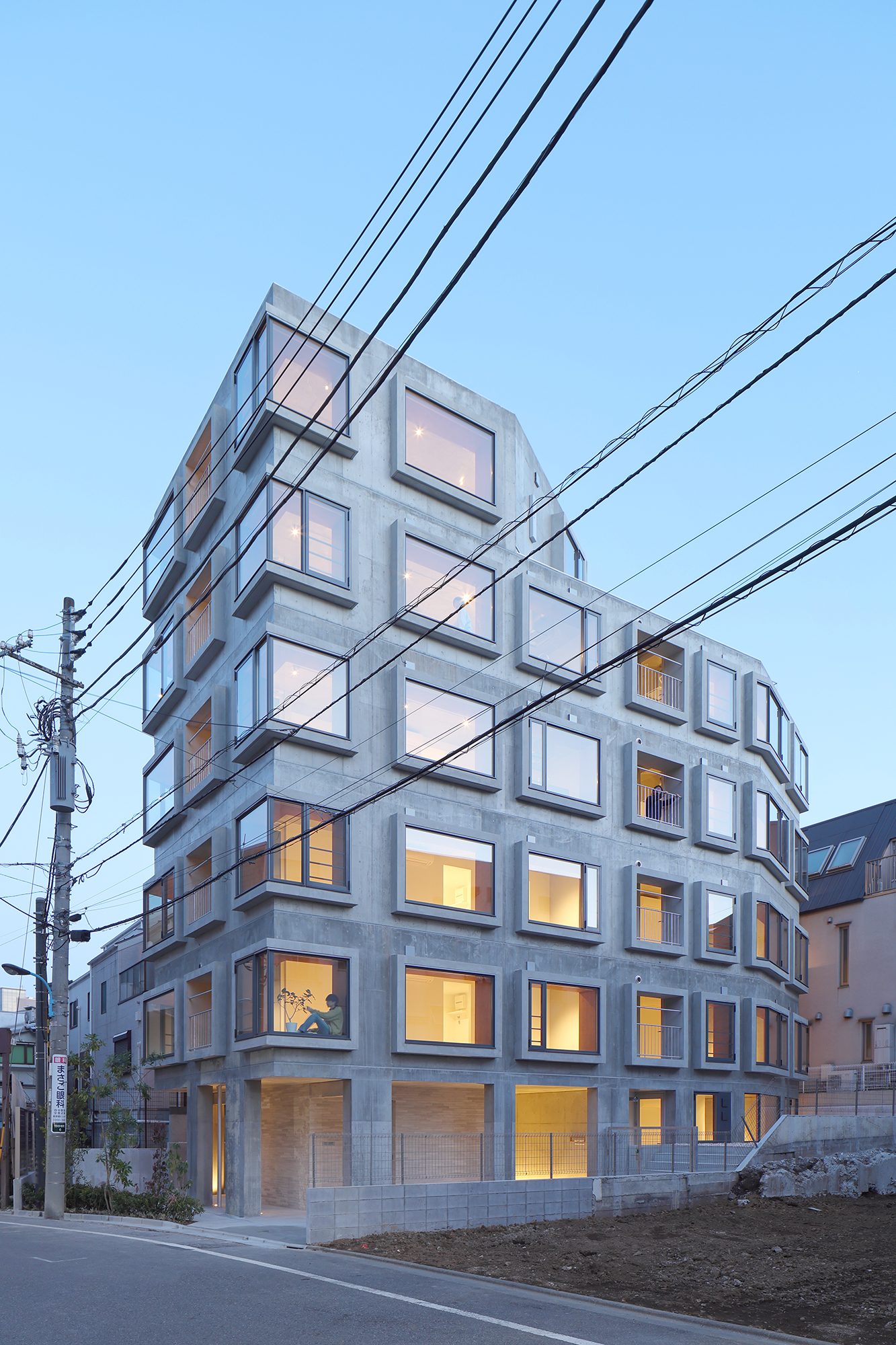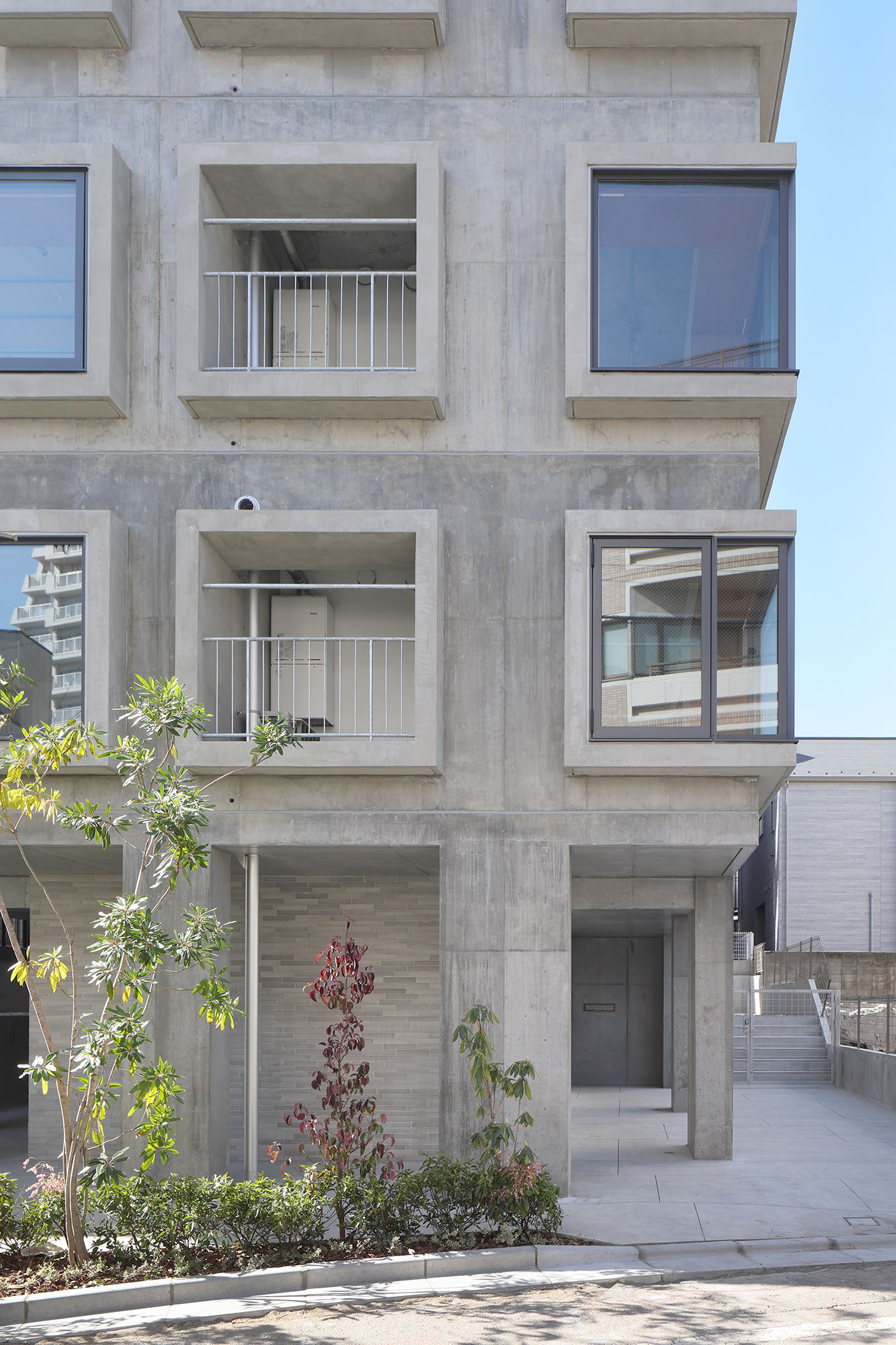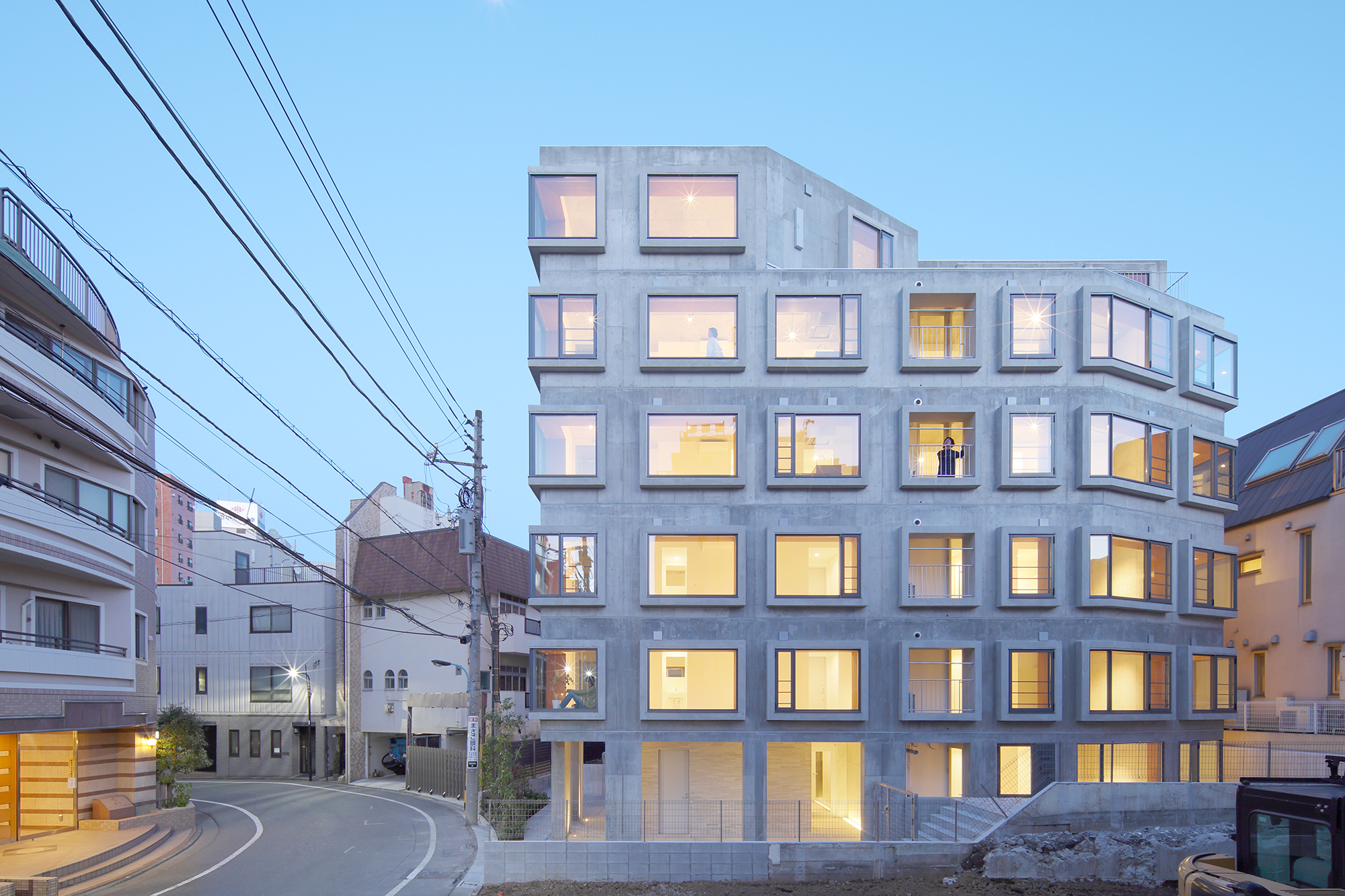 外壁は、柱・梁以外をすべて開口部とし、その縁をわずかに外に伸ばすことで奥行の深いゆったりとこしかけることのできる窓とした。「こしかけ窓」と名付けたこれらの窓は、ベンチやサイドボードなど多用途に使うことが可能であり、少ない家具で住み始める単身者にとって生活の手掛かりとなる。窓に奥行きがあることでダイニング、リビング、寝室など、ワンルームの中に複数の生活領域をつくりだす。各戸のテラスにも同形状の奥行と開口を持たせることで、住戸の境が一見分からない、全周に凹凸のある外観が生まれた。