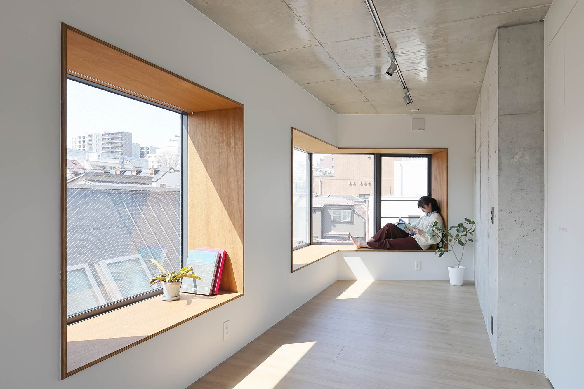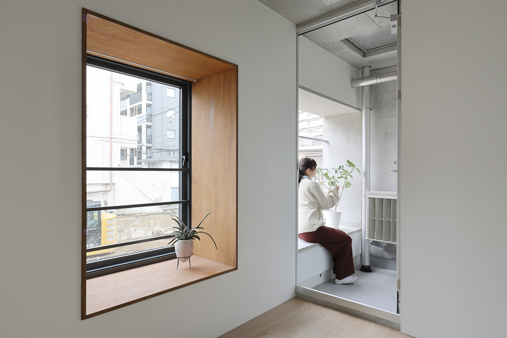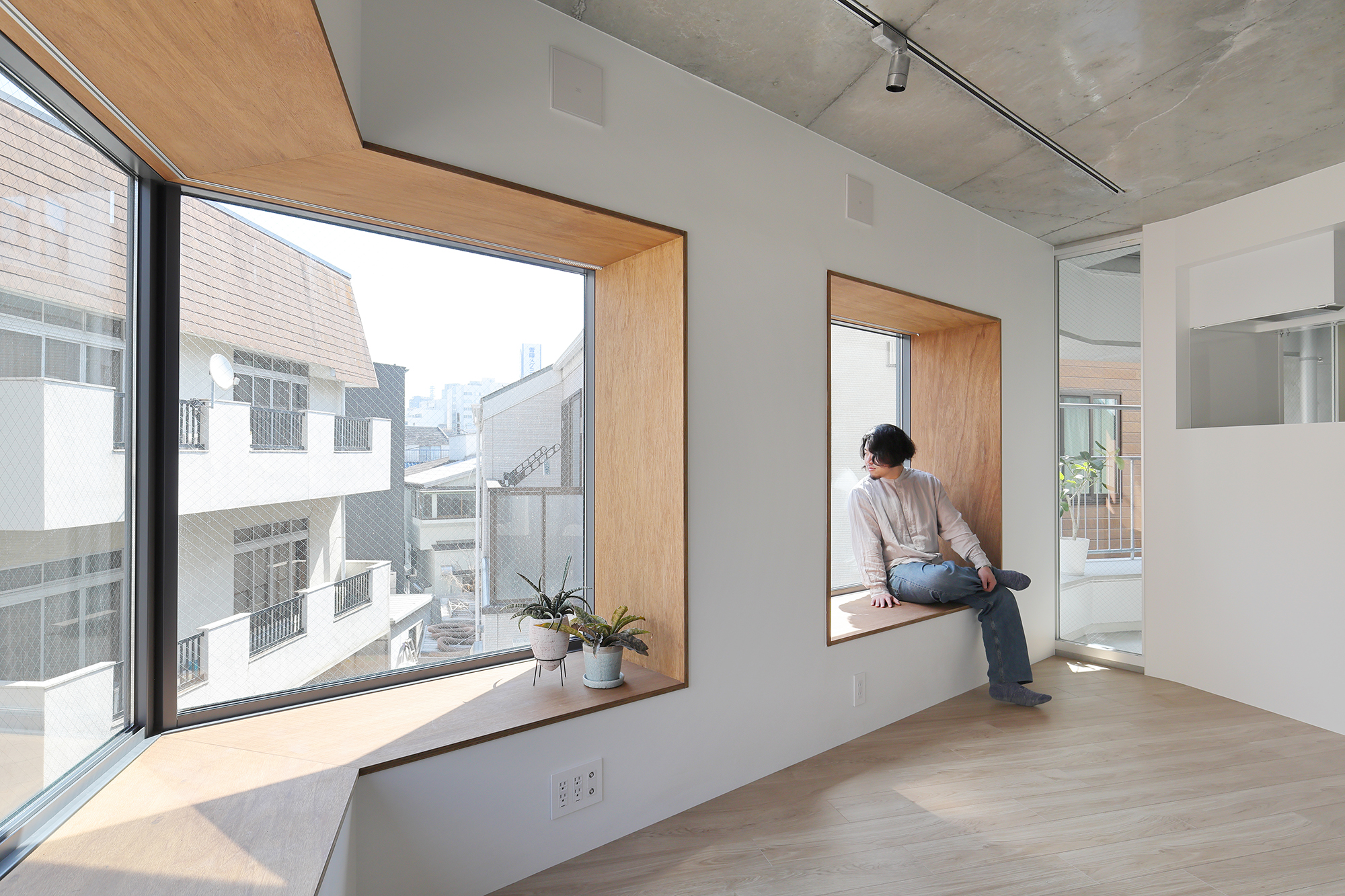 こしかけ窓に座って光や風を感じながら街を望む。内外の境界に身を置いて過ごすことで、面積によらないのびやかな暮らしと都市の風景が強く結びつくことを期待した。