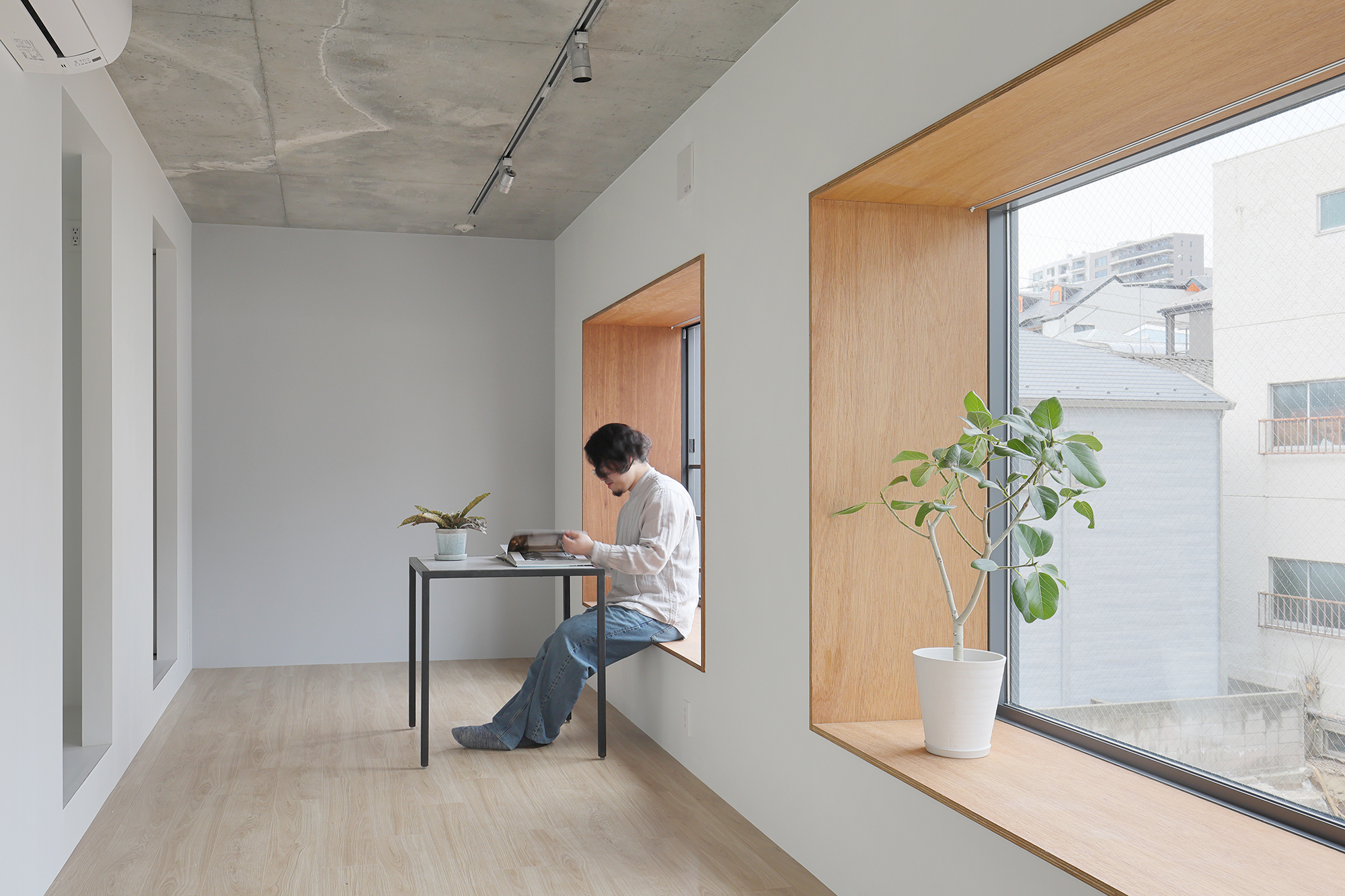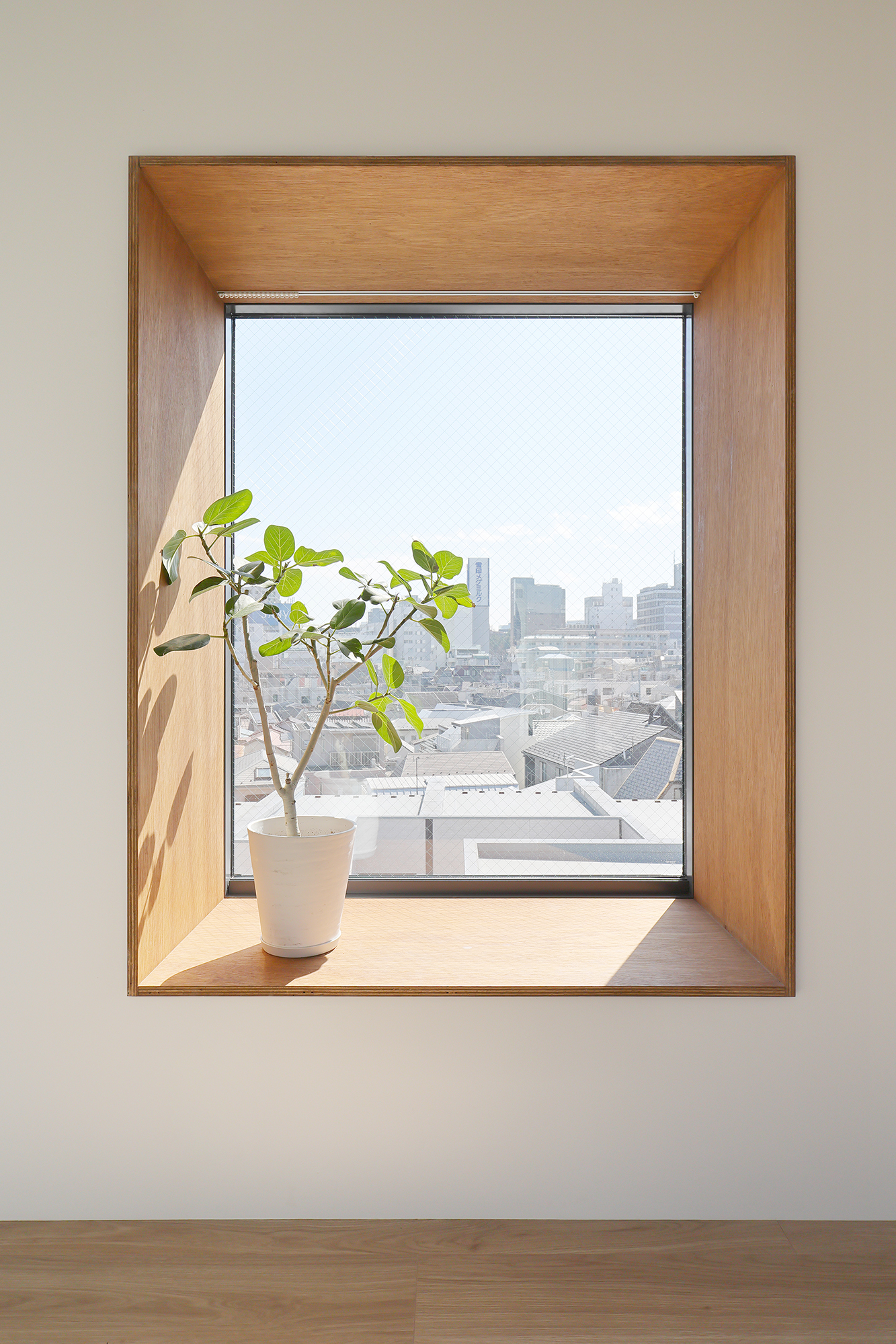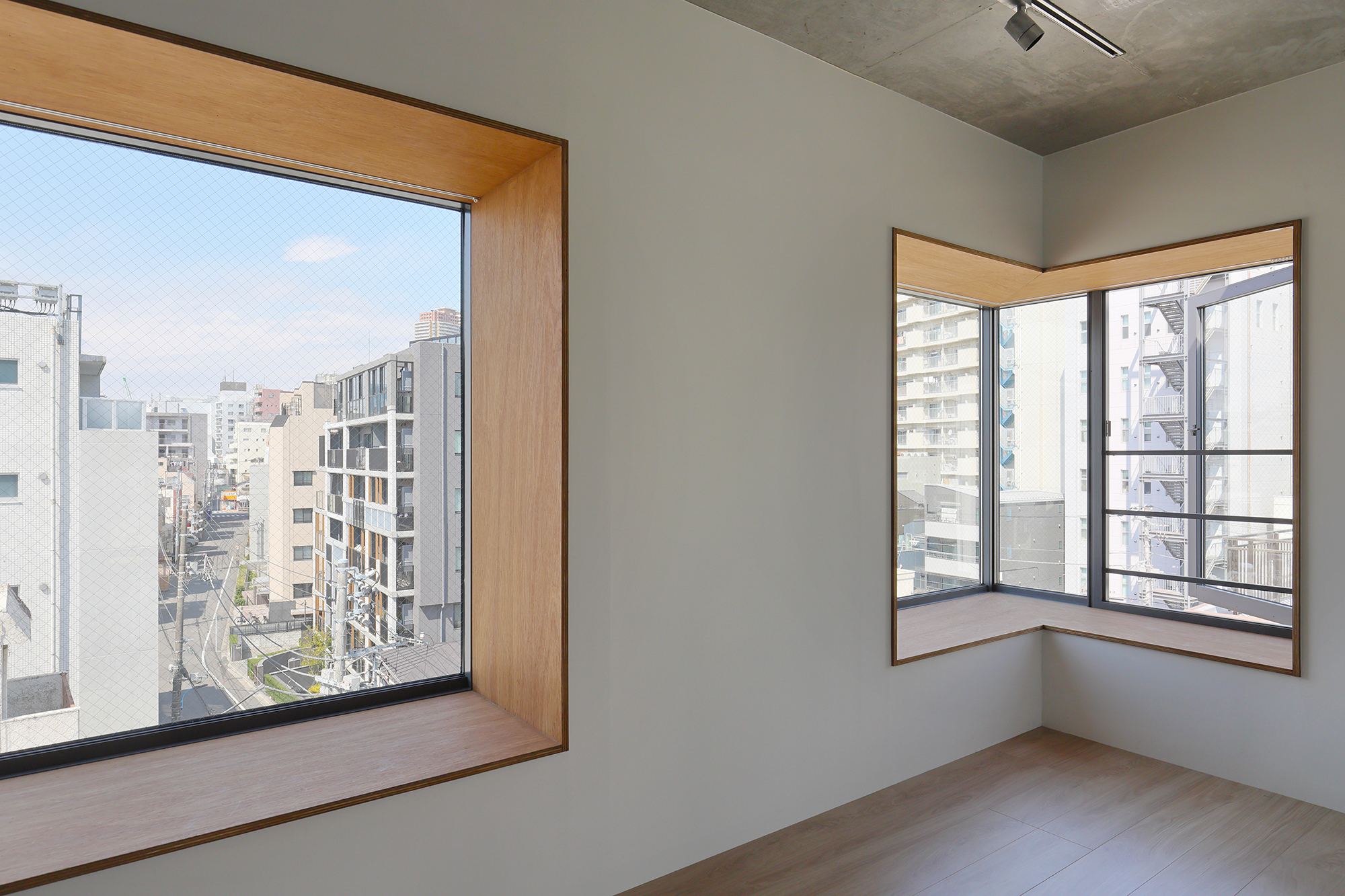 こしかけ窓に座って光や風を感じながら街を望む。内外の境界に身を置いて過ごすことで、面積によらないのびやかな暮らしと都市の風景が強く結びつくことを期待した。