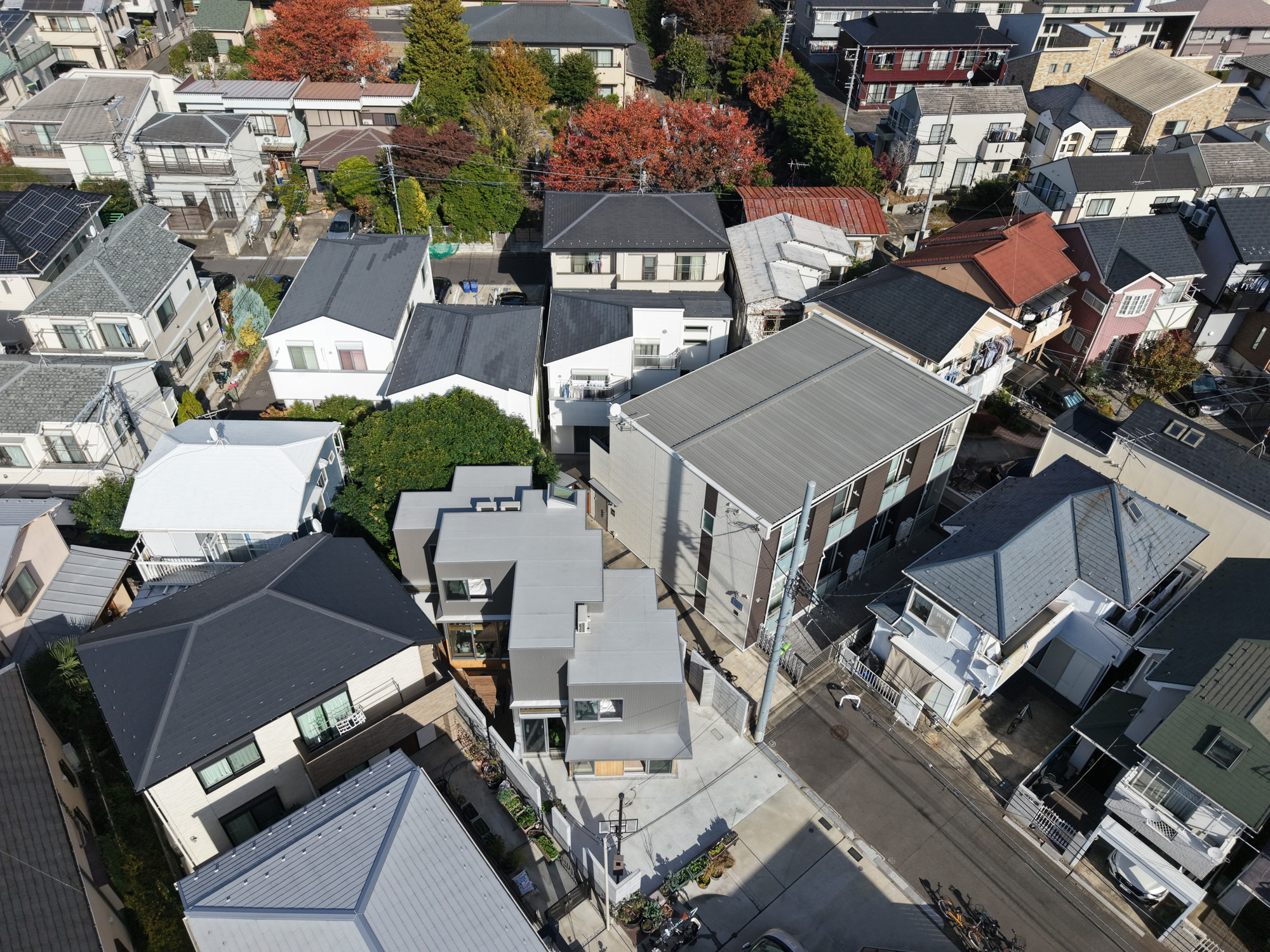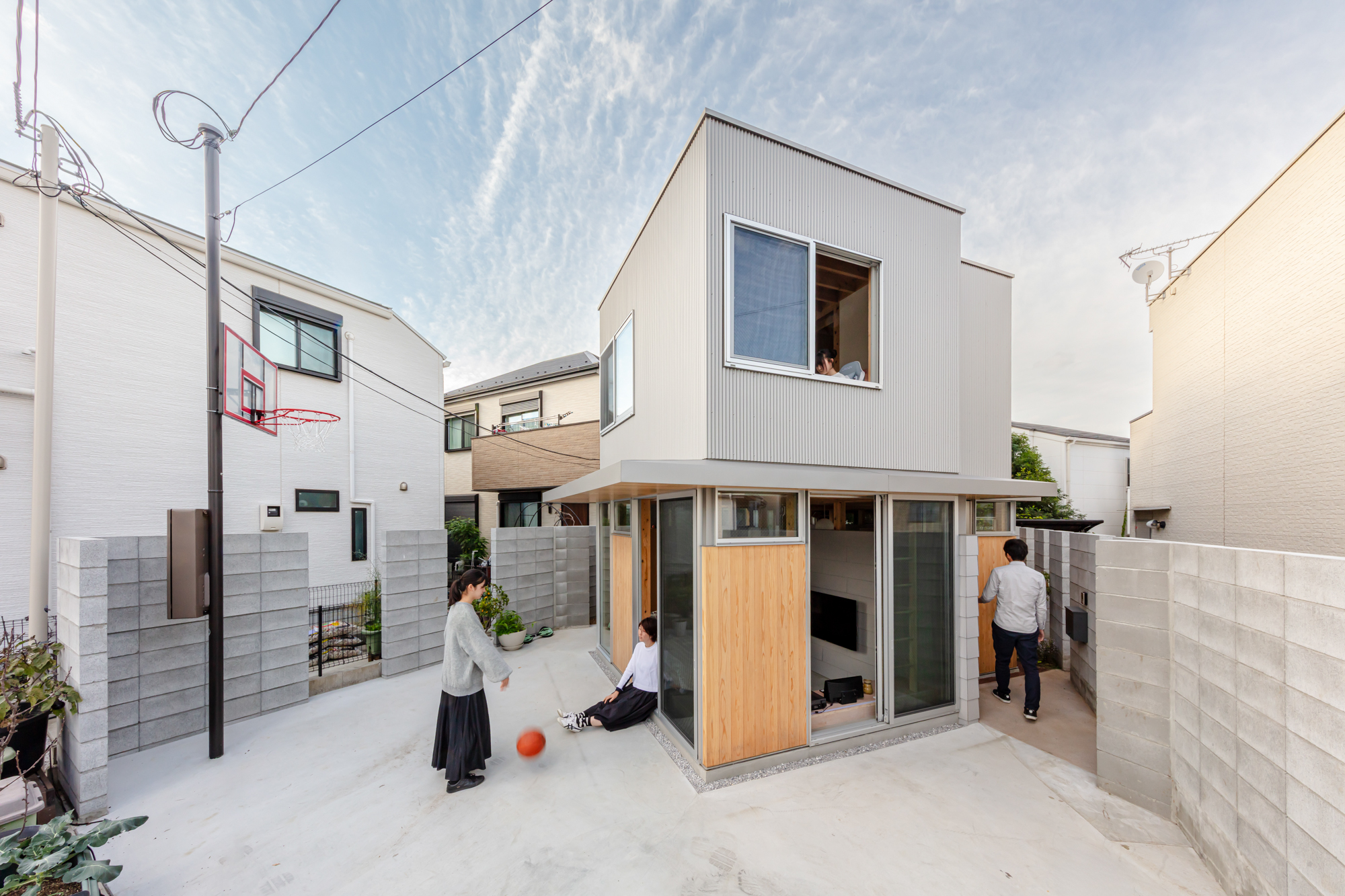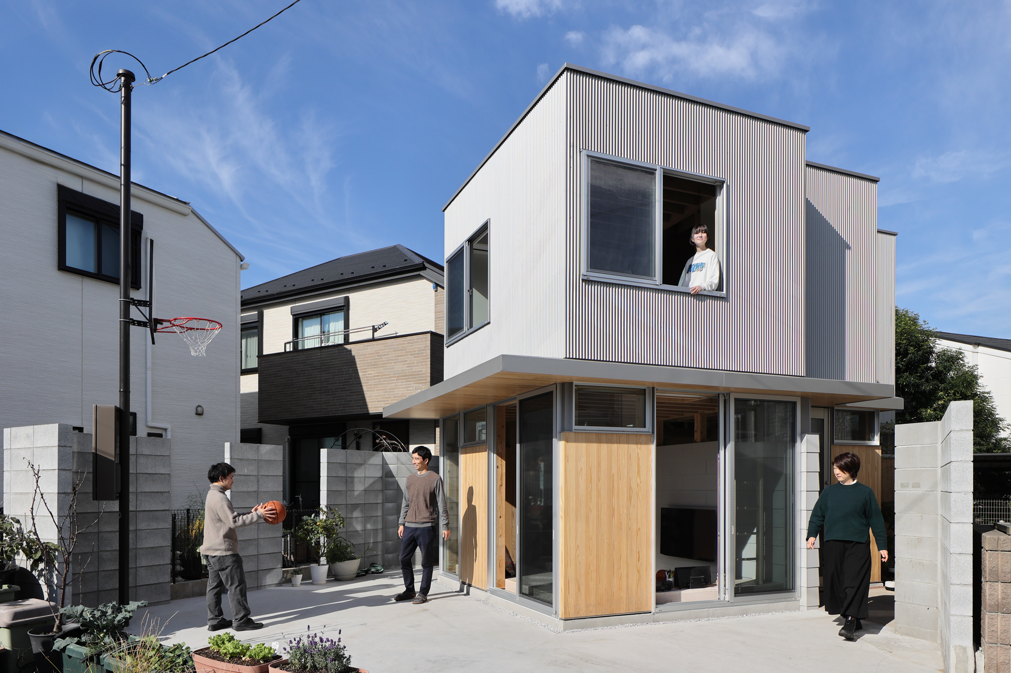 世田谷区の住宅街に建つ、設計者とその夫、娘2人のための自邸である。娘が中高生になったことで、見通しの良い広い居間には個人の居場所が無いと感じることが増えた。複数人はもちろん、1人でいても楽しむことのできる空間を多数設けるために、nLDKと庭を細分化し再編を試みた。