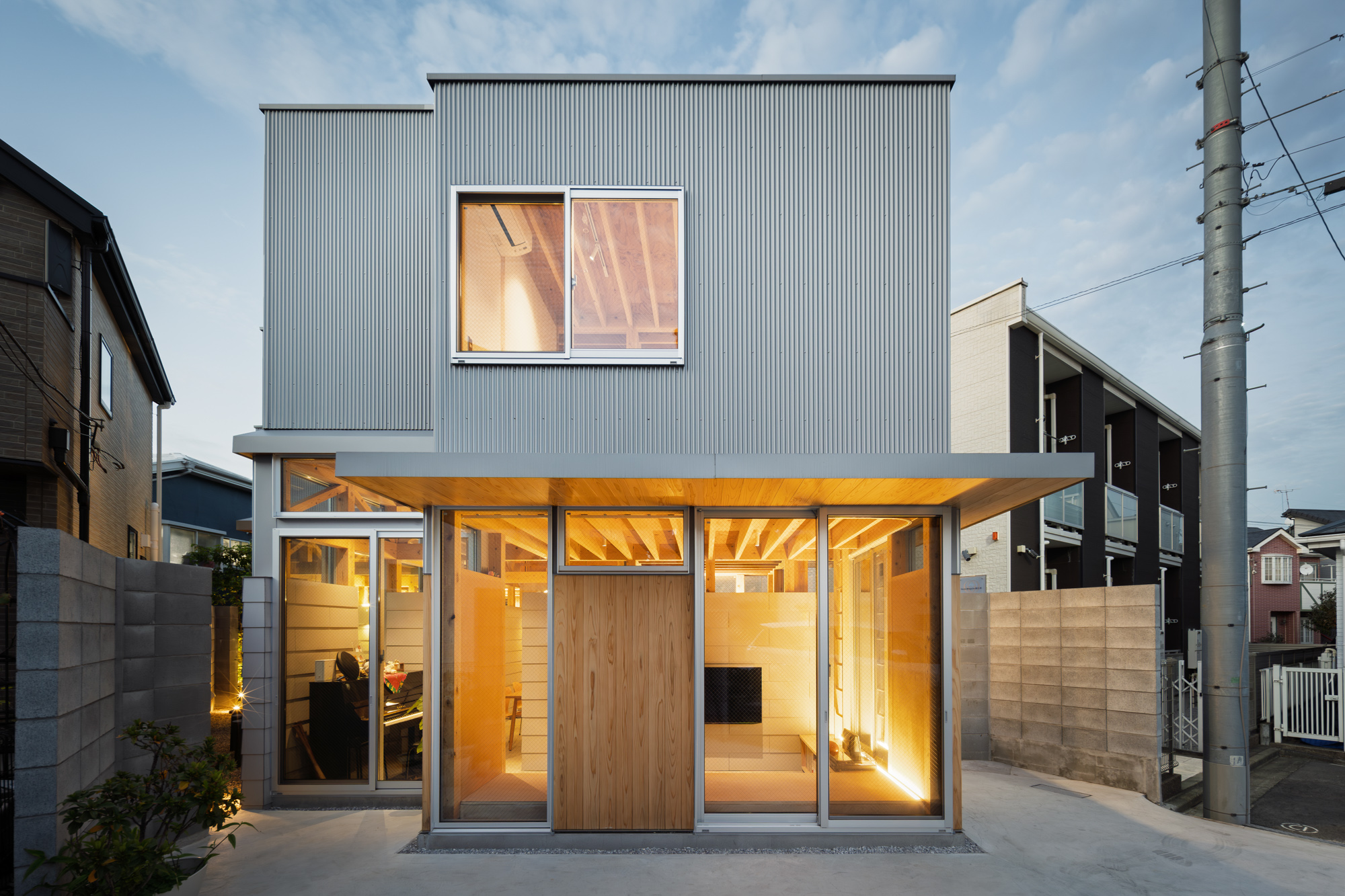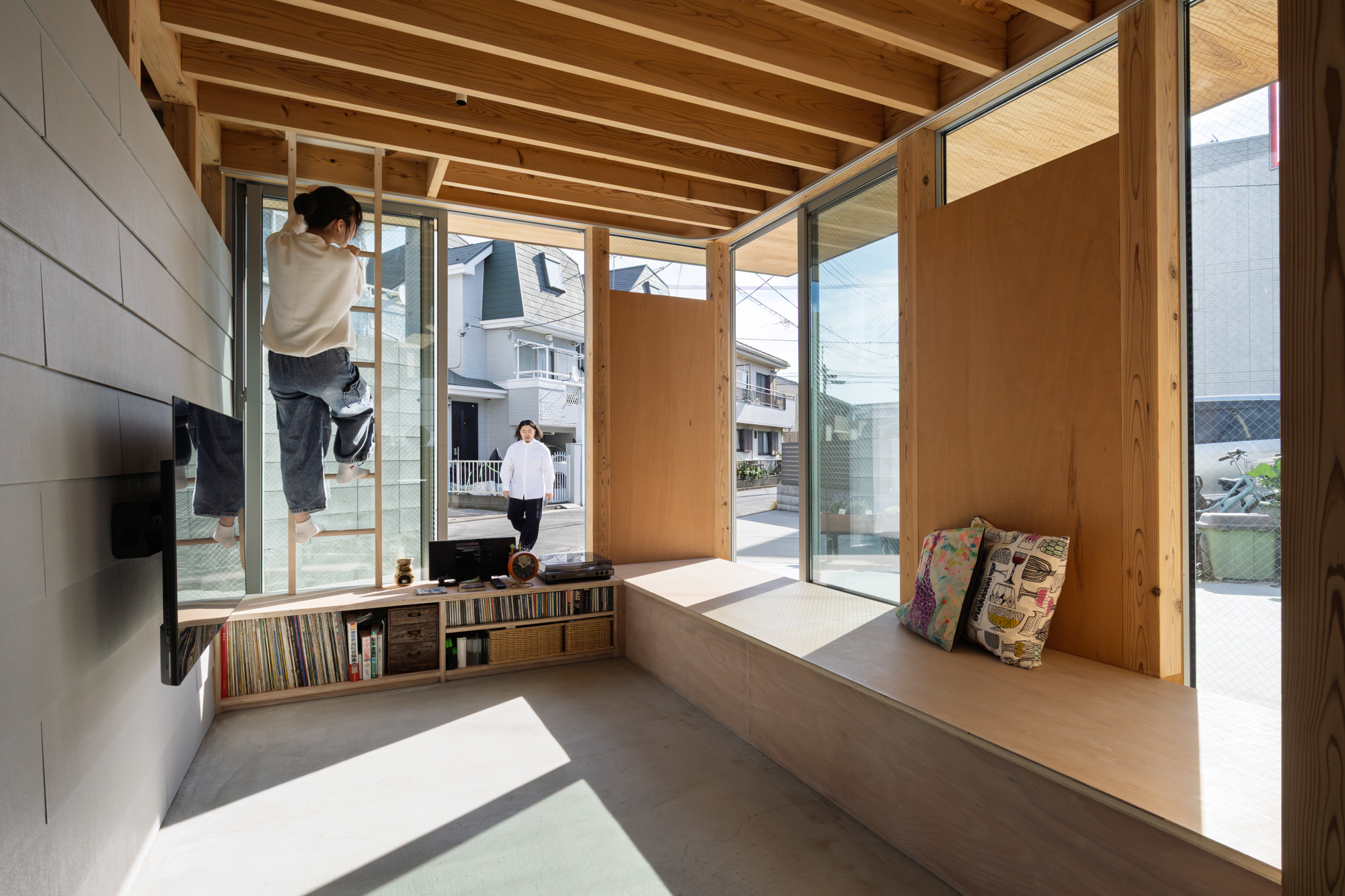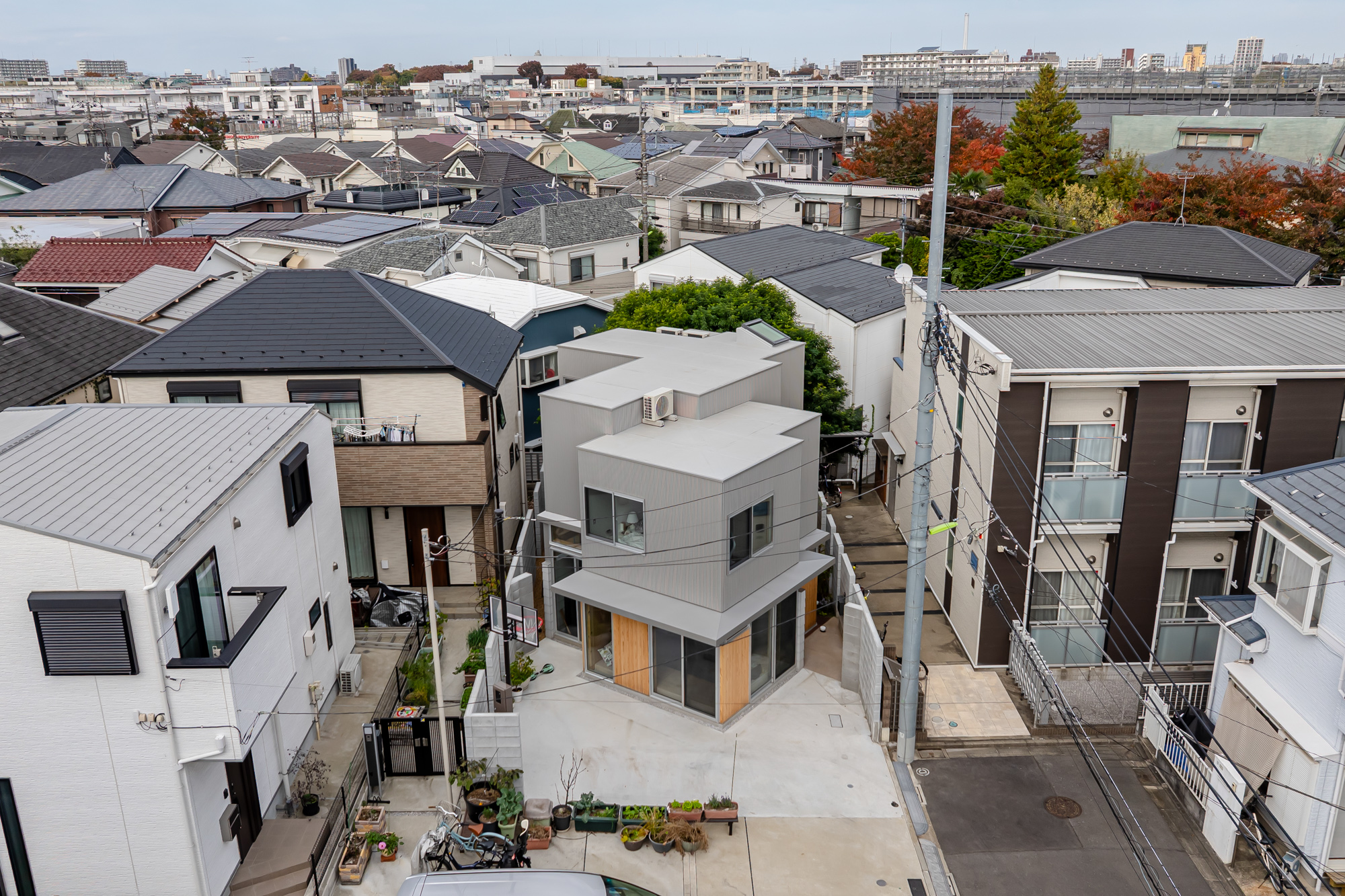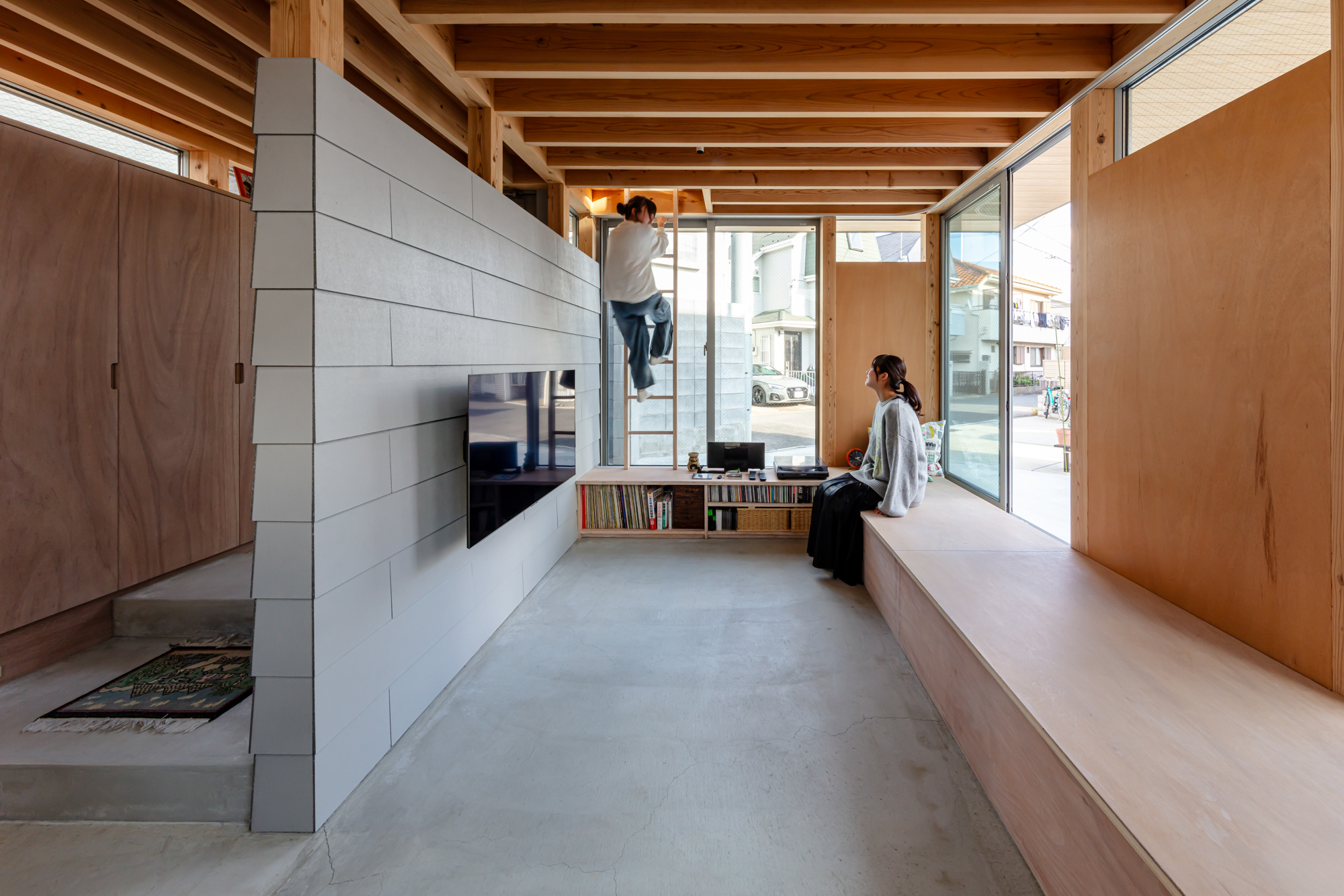 世田谷区の住宅街に建つ、設計者とその夫、娘2人のための自邸である。娘が中高生になったことで、見通しの良い広い居間には個人の居場所が無いと感じることが増えた。複数人はもちろん、1人でいても楽しむことのできる空間を多数設けるために、nLDKと庭を細分化し再編を試みた。