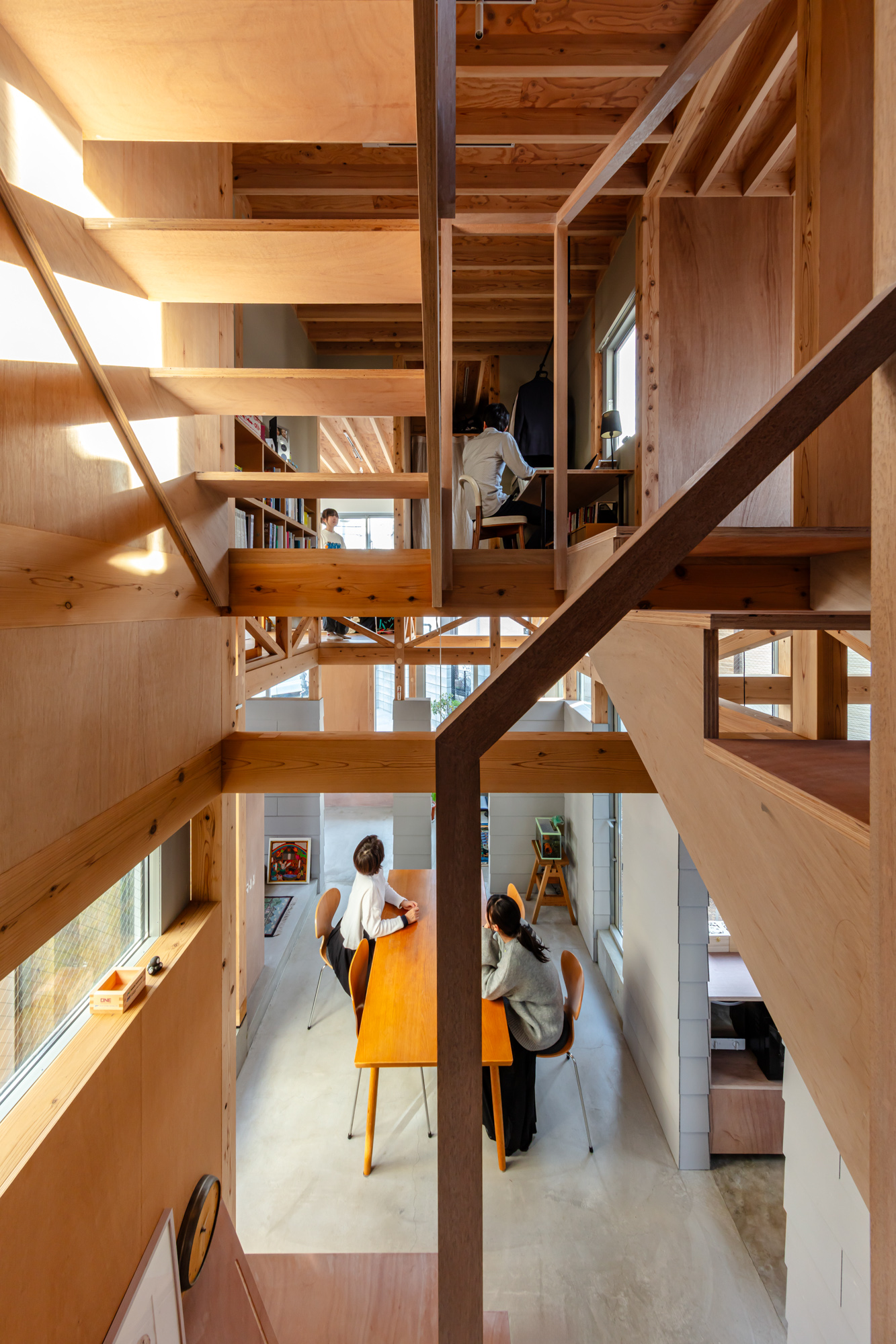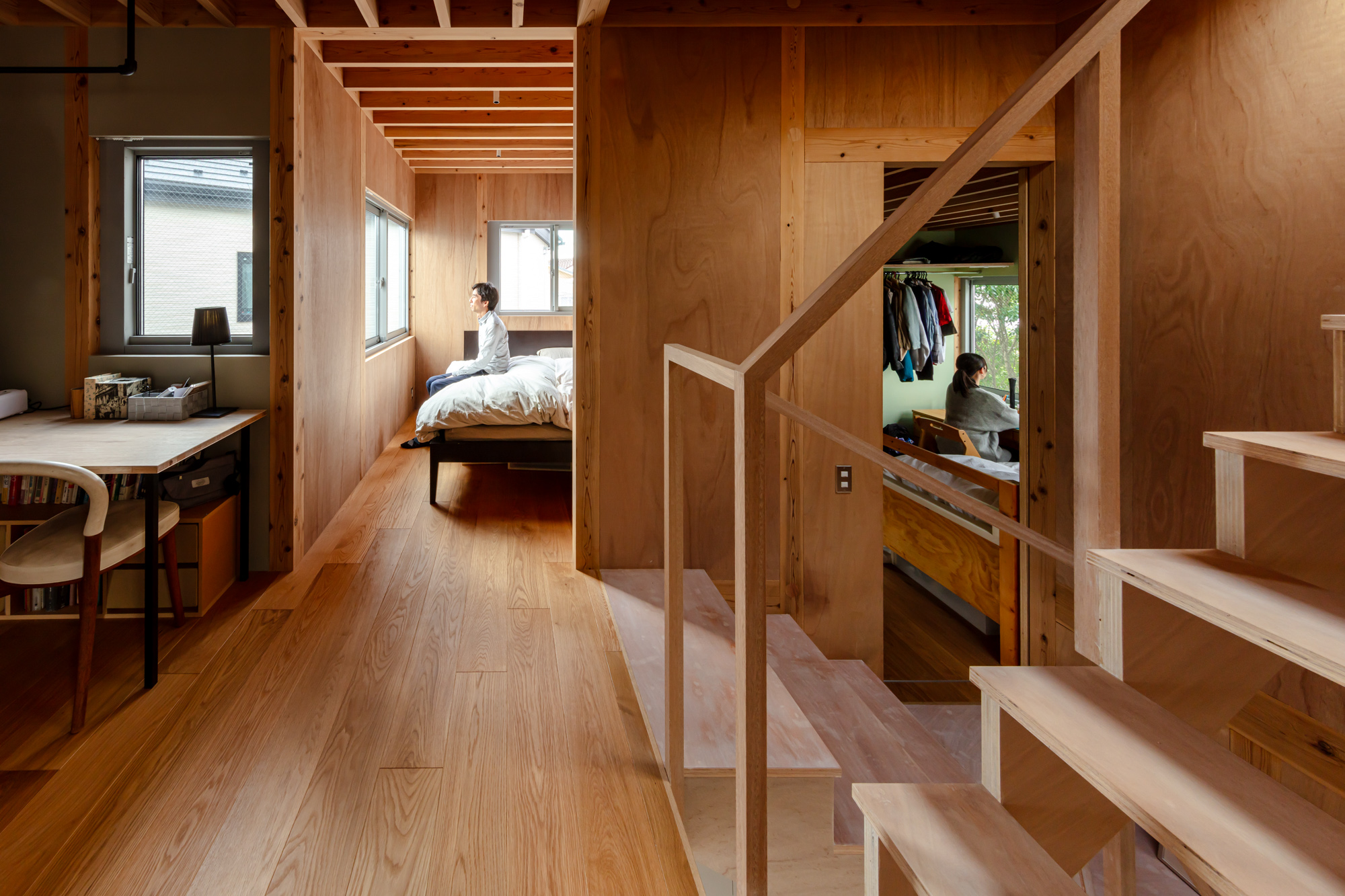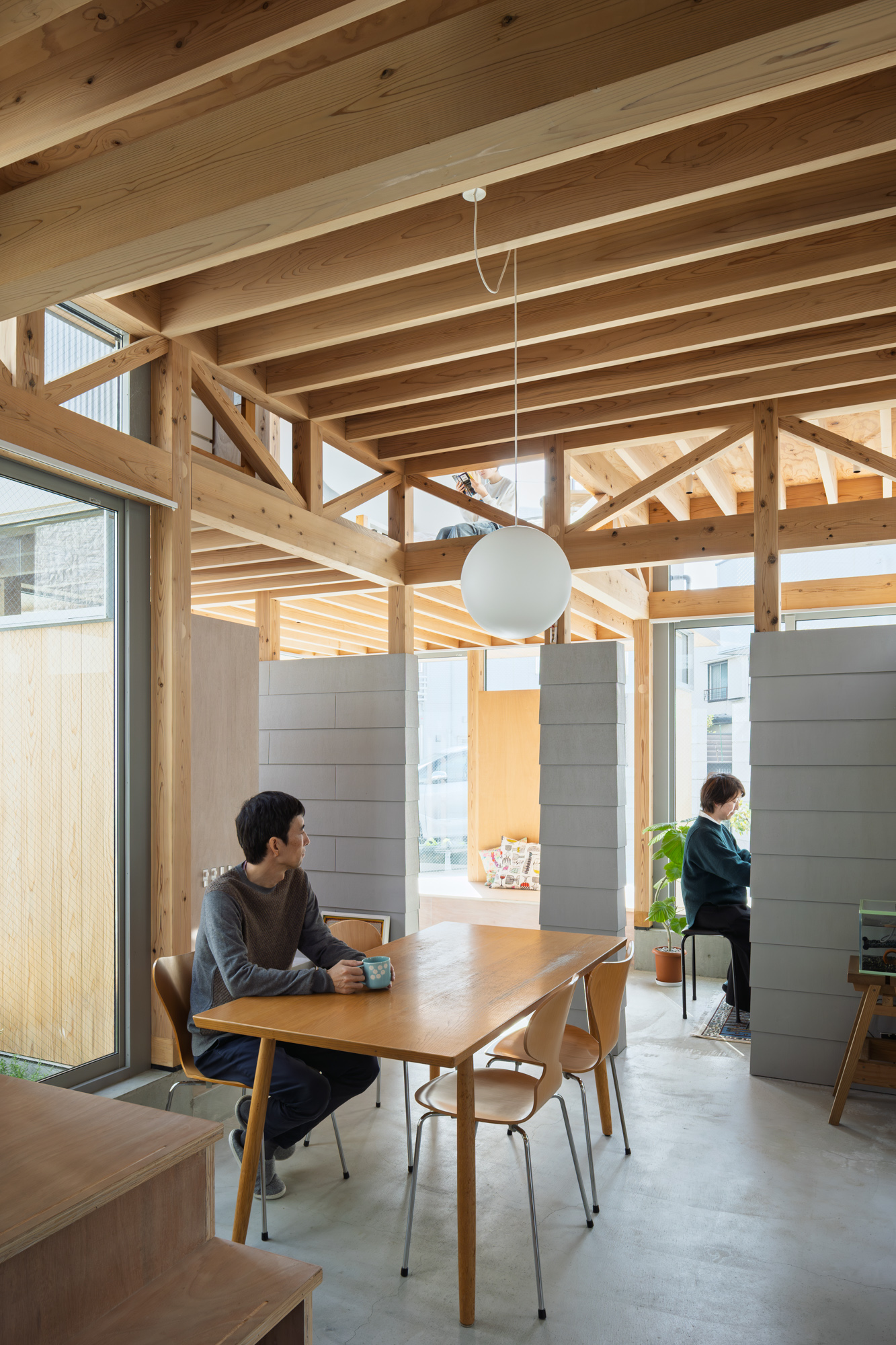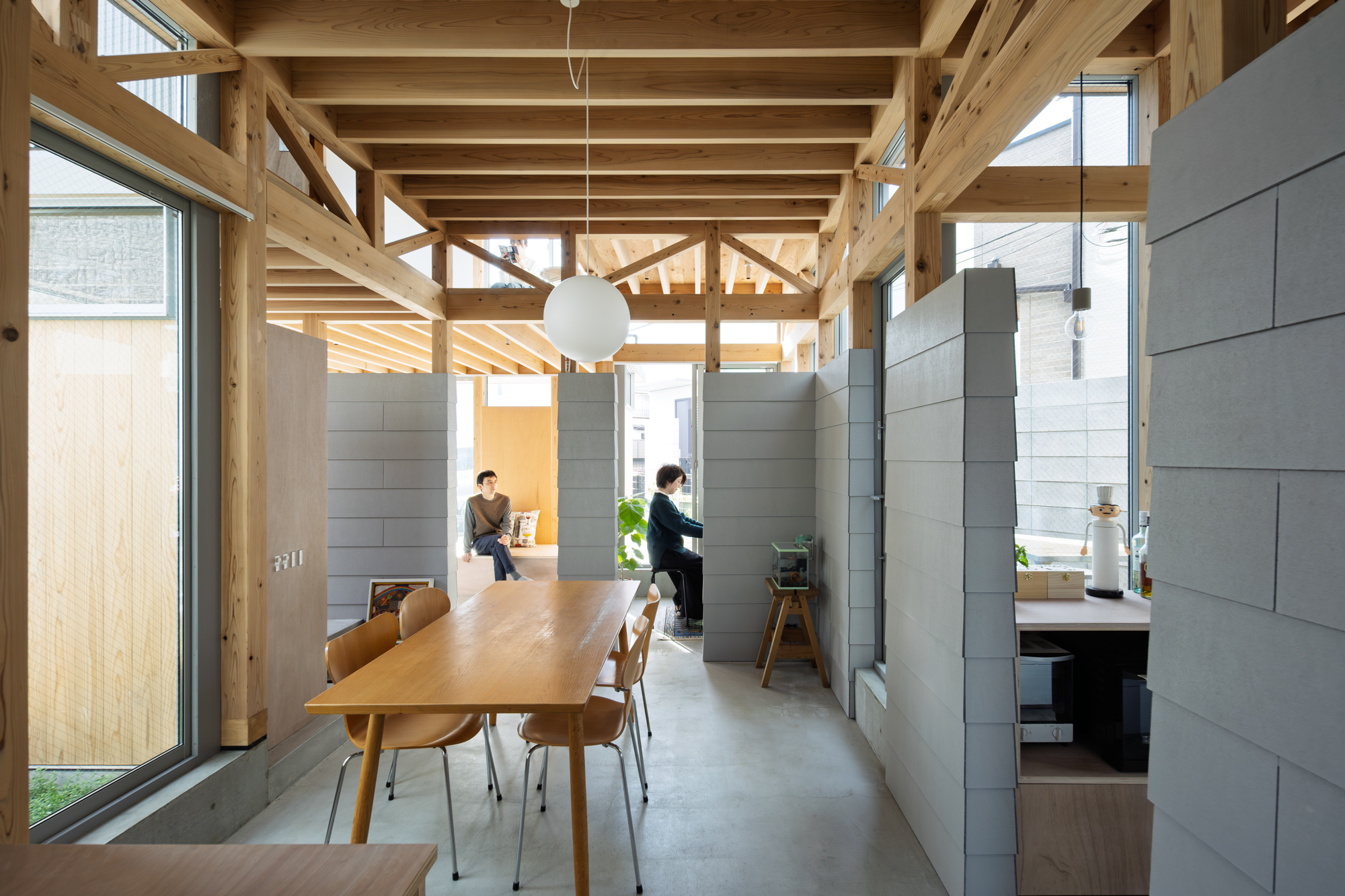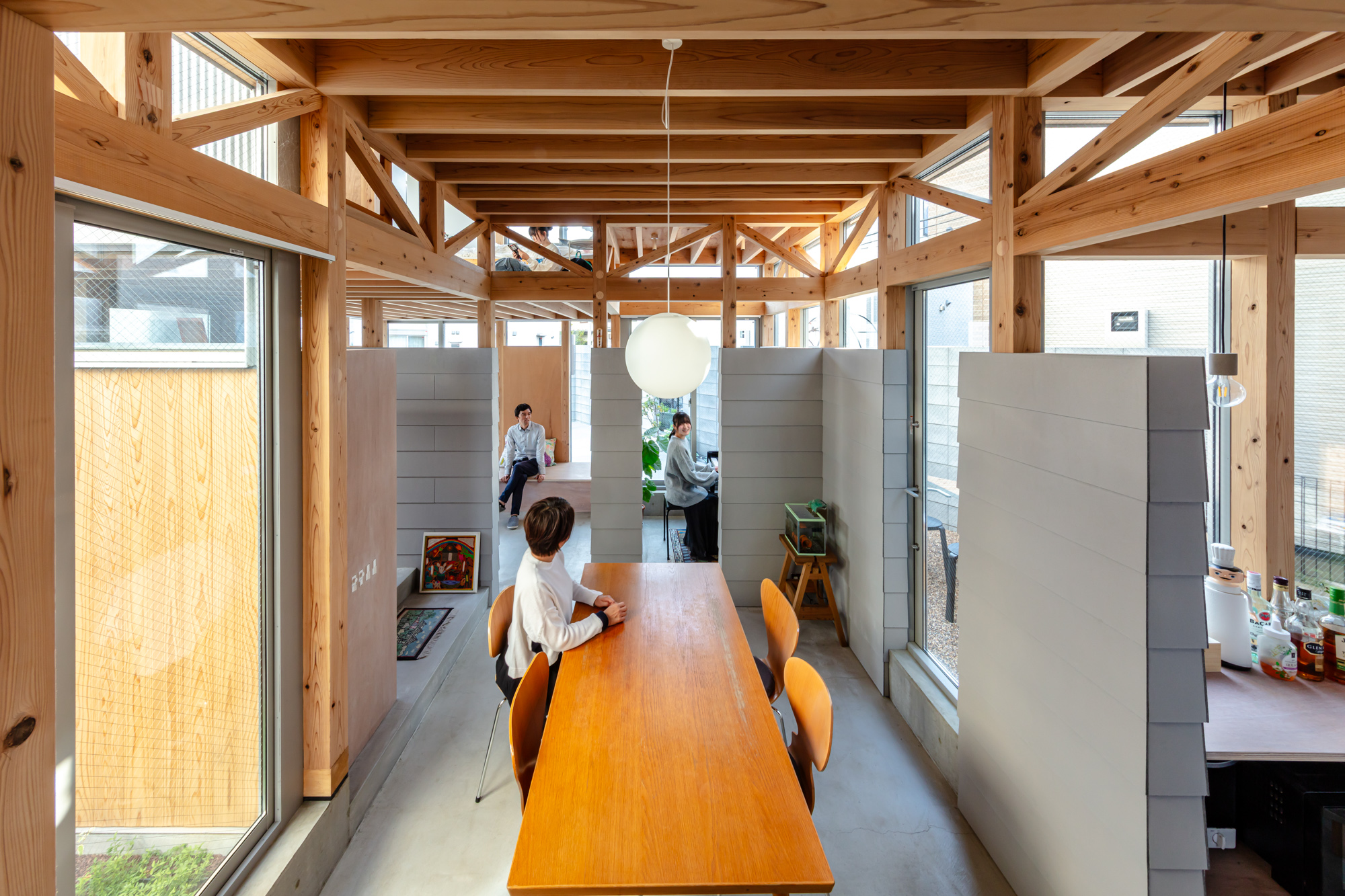 その上に、下階の壁と切り離して8つの小屋を浮かべた。個々の小さなプライベートスペースとしての小屋が、開口を共有しながら隣り合う。小屋の床に2つのレベルを与えたことで、家のどこにいてもお互いの気配を感じることが出来る。