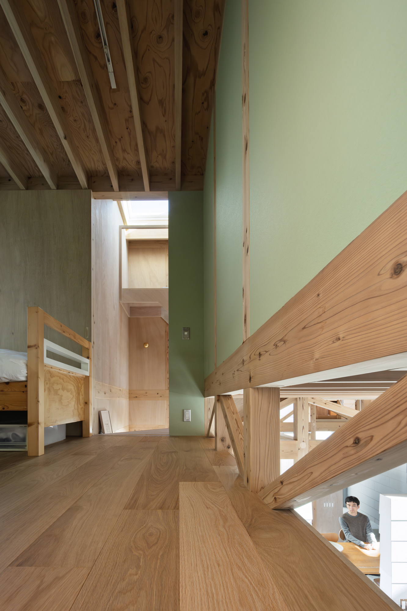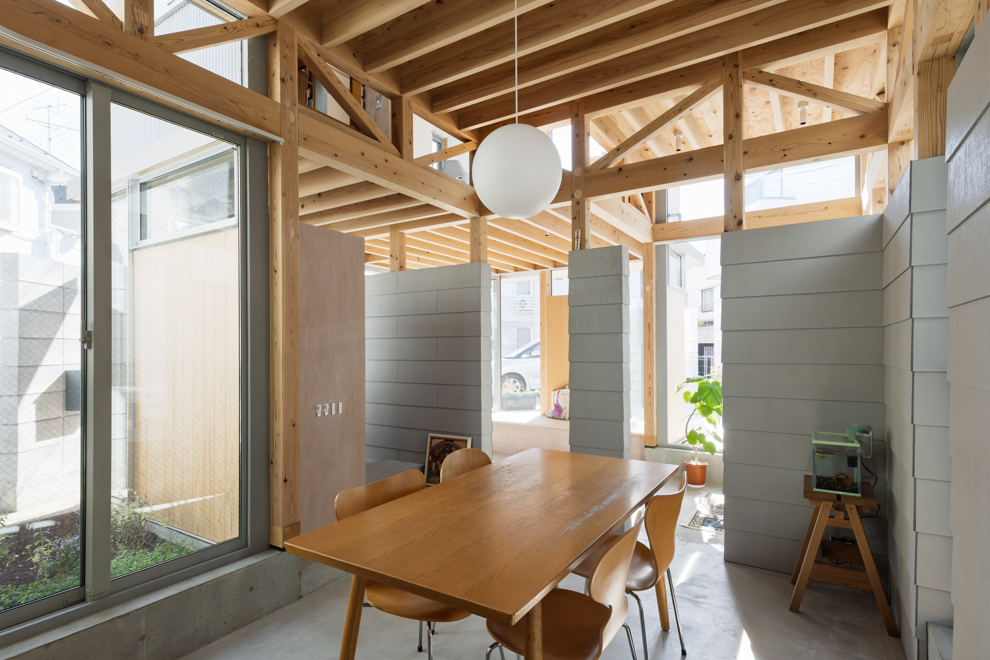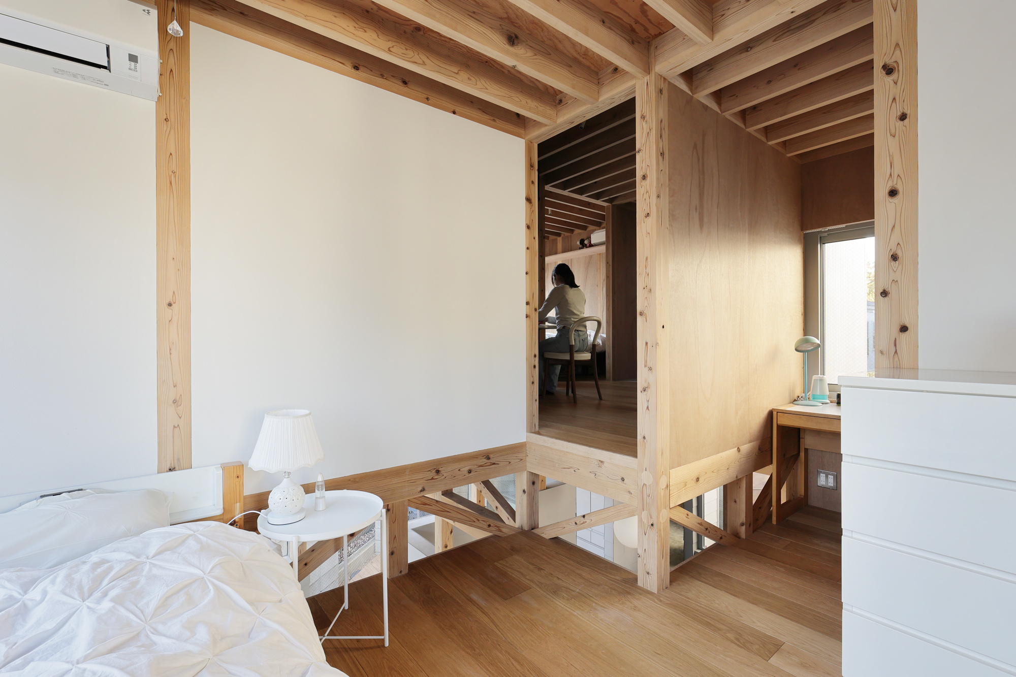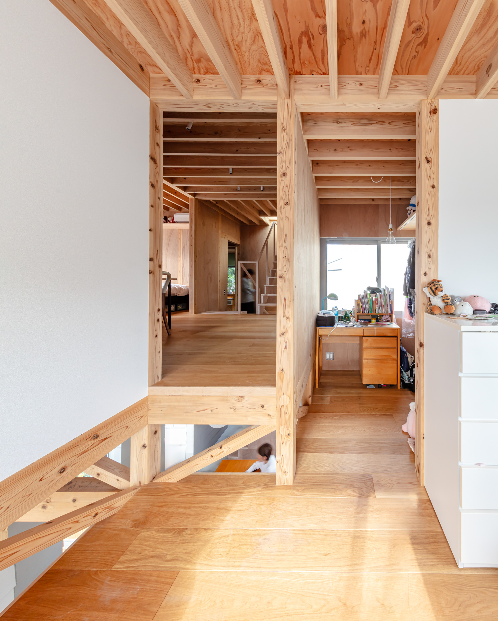 その上に、下階の壁と切り離して8つの小屋を浮かべた。個々の小さなプライベートスペースとしての小屋が、開口を共有しながら隣り合う。小屋の床に2つのレベルを与えたことで、家のどこにいてもお互いの気配を感じることが出来る。