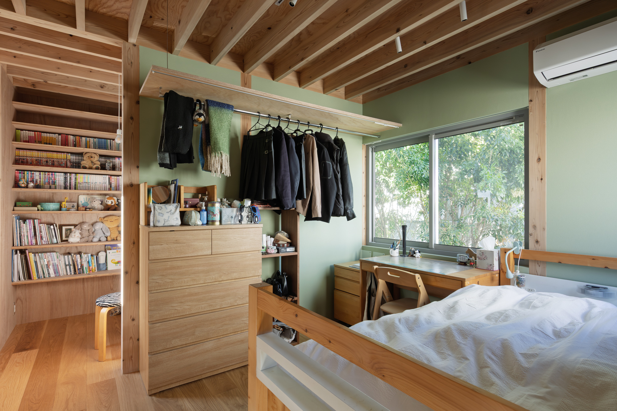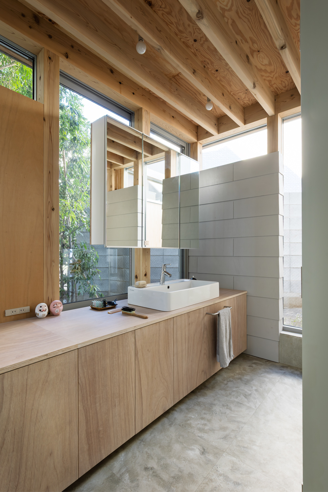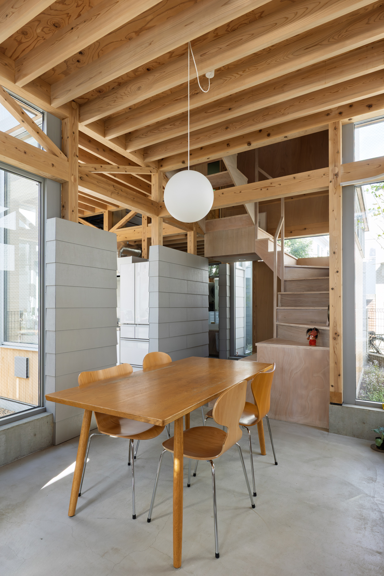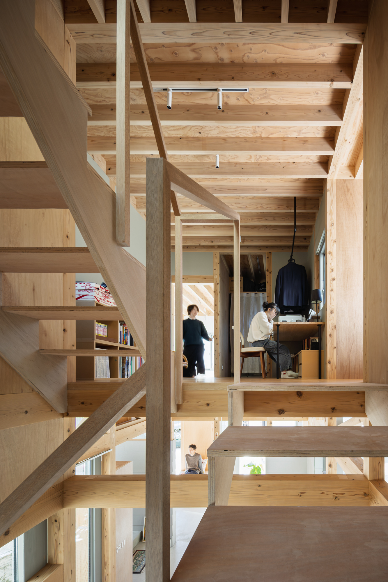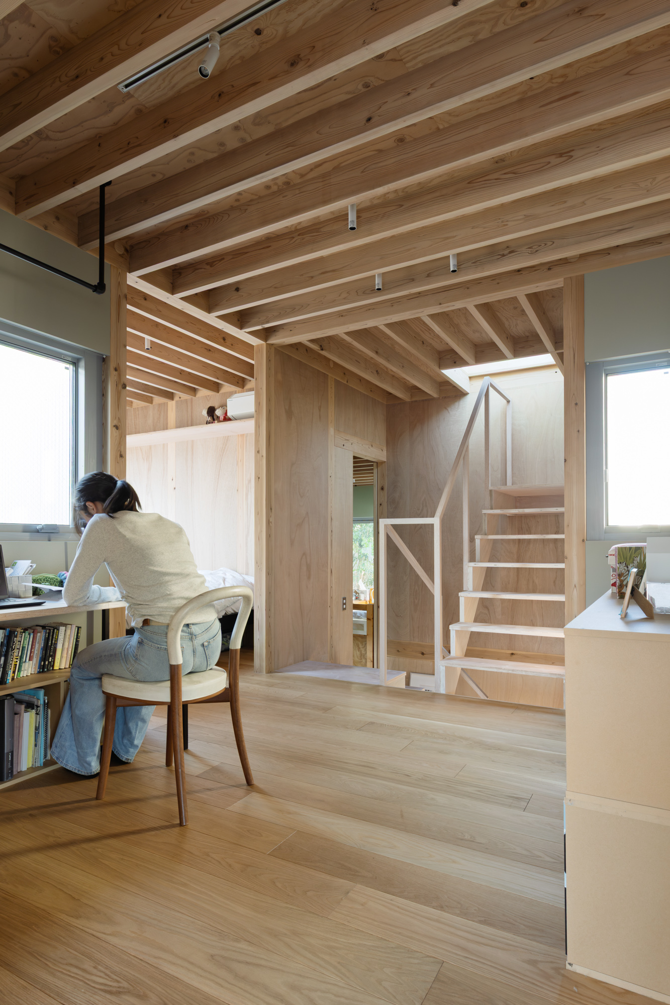 その上に、下階の壁と切り離して8つの小屋を浮かべた。個々の小さなプライベートスペースとしての小屋が、開口を共有しながら隣り合う。小屋の床に2つのレベルを与えたことで、家のどこにいてもお互いの気配を感じることが出来る。