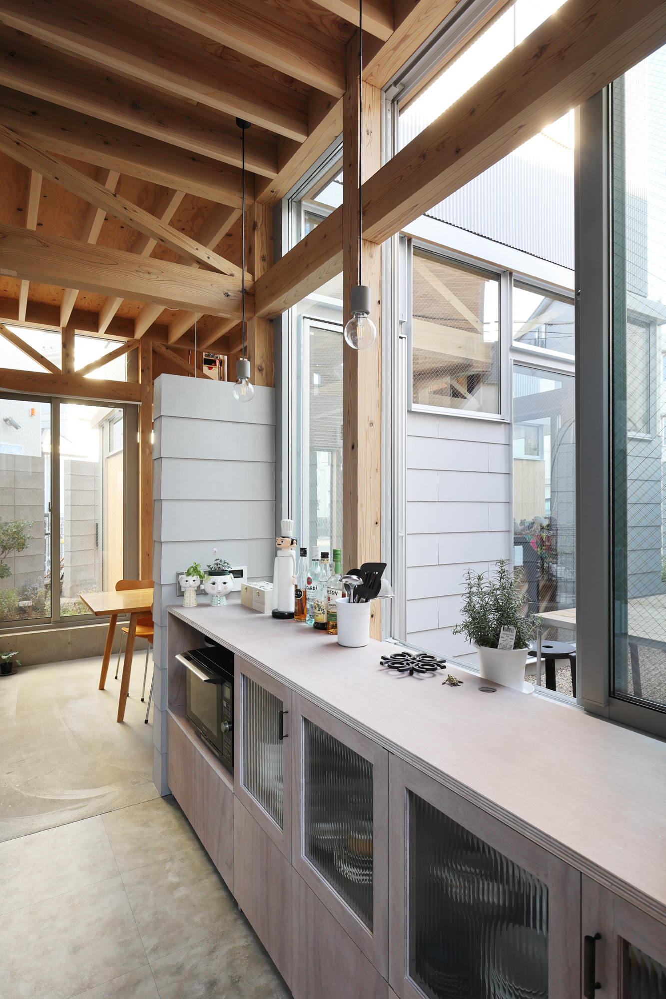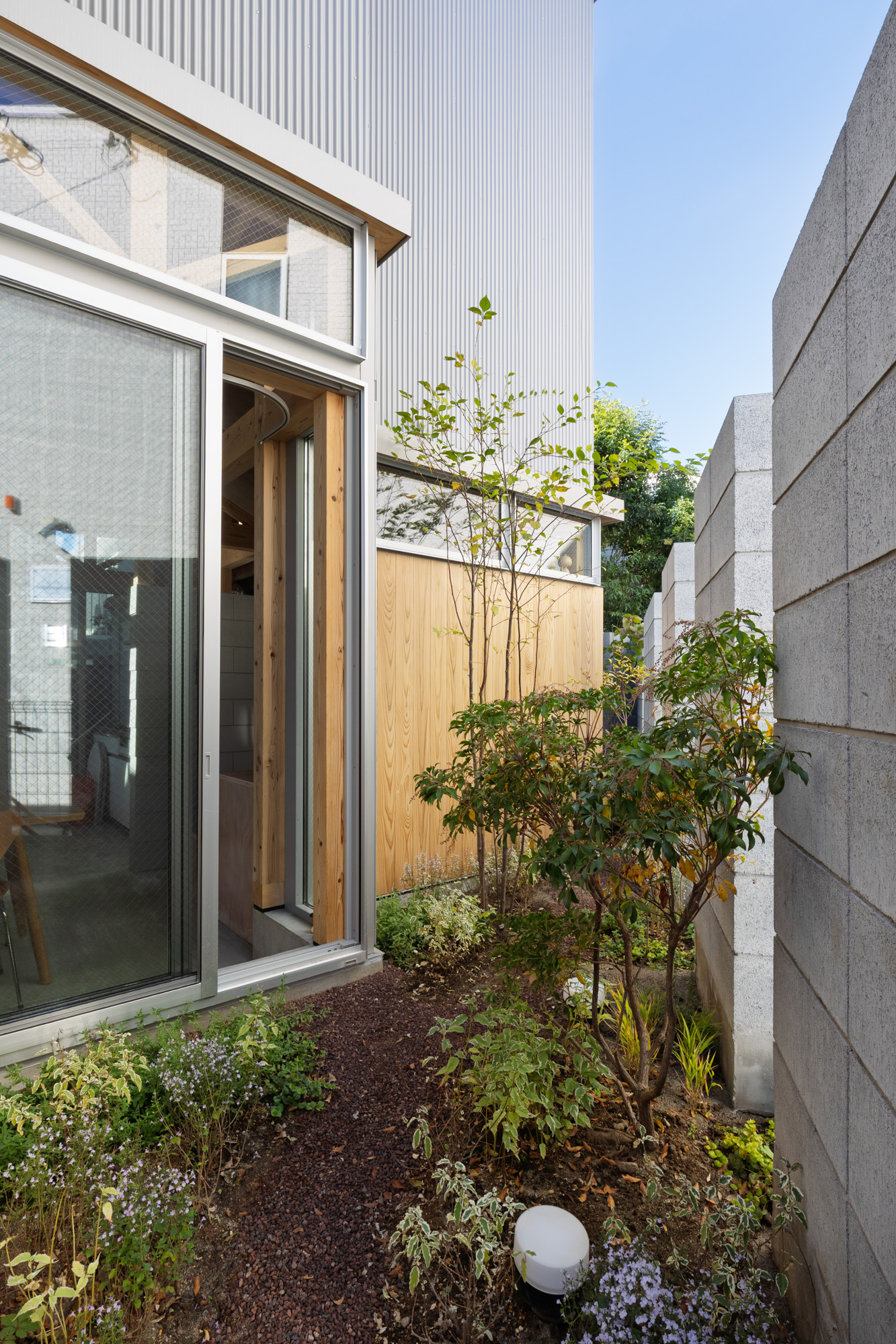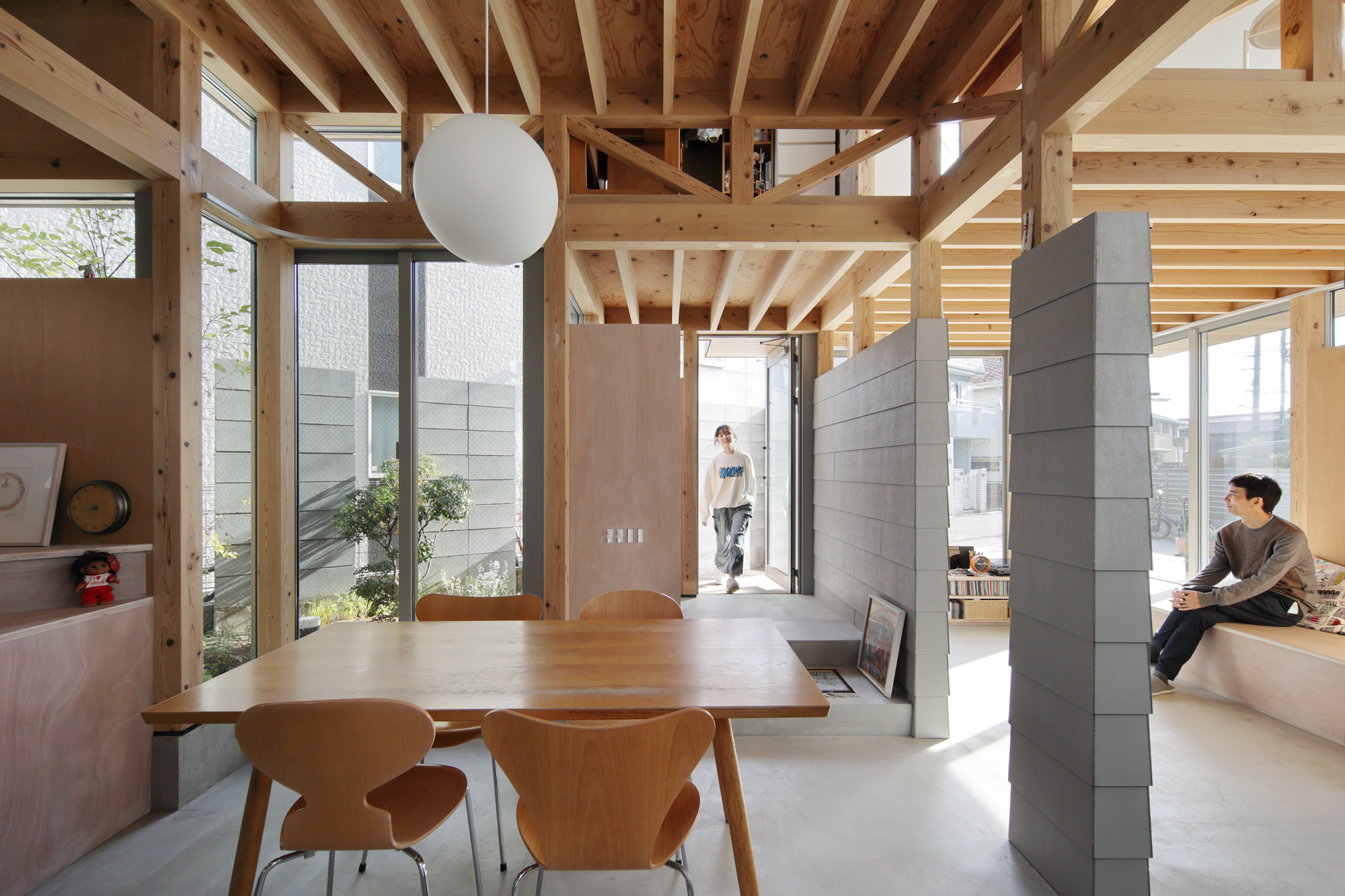 1階では、敷地周囲に隙間を空けながら塀を建て、それを内部にも引き込み4つの庭と4つの共用スペースをつくった。各スペースを敷地に対して角度を持って並べることで、隣戸からの距離を保つと同時に、周囲の庭に季節や時間によって様々な角度から光が入るようになった。