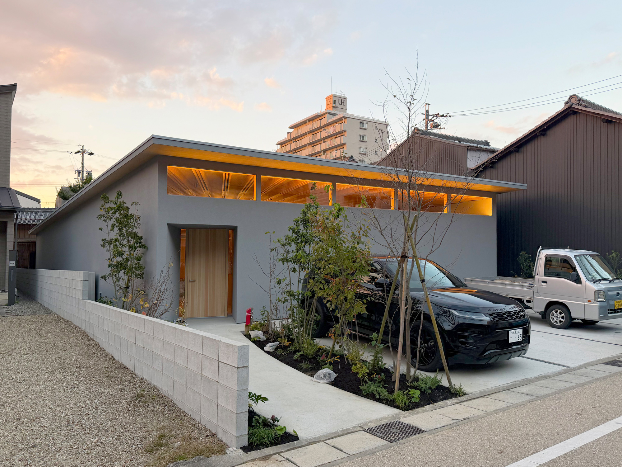 岐阜市内で有名な中華料理店の移転と、それを営む夫婦+子供1人が暮らす店舗兼用住宅である。地元で最も長い歴史を持つ伊奈波神社のほど近く、古い町家がまだ多く残る通りに建つ。夜営業の店舗の為、来客が食事に集中できることはもちろん、その時間に小さな子供が安心して両親の存在を感じられる環境が求められた。