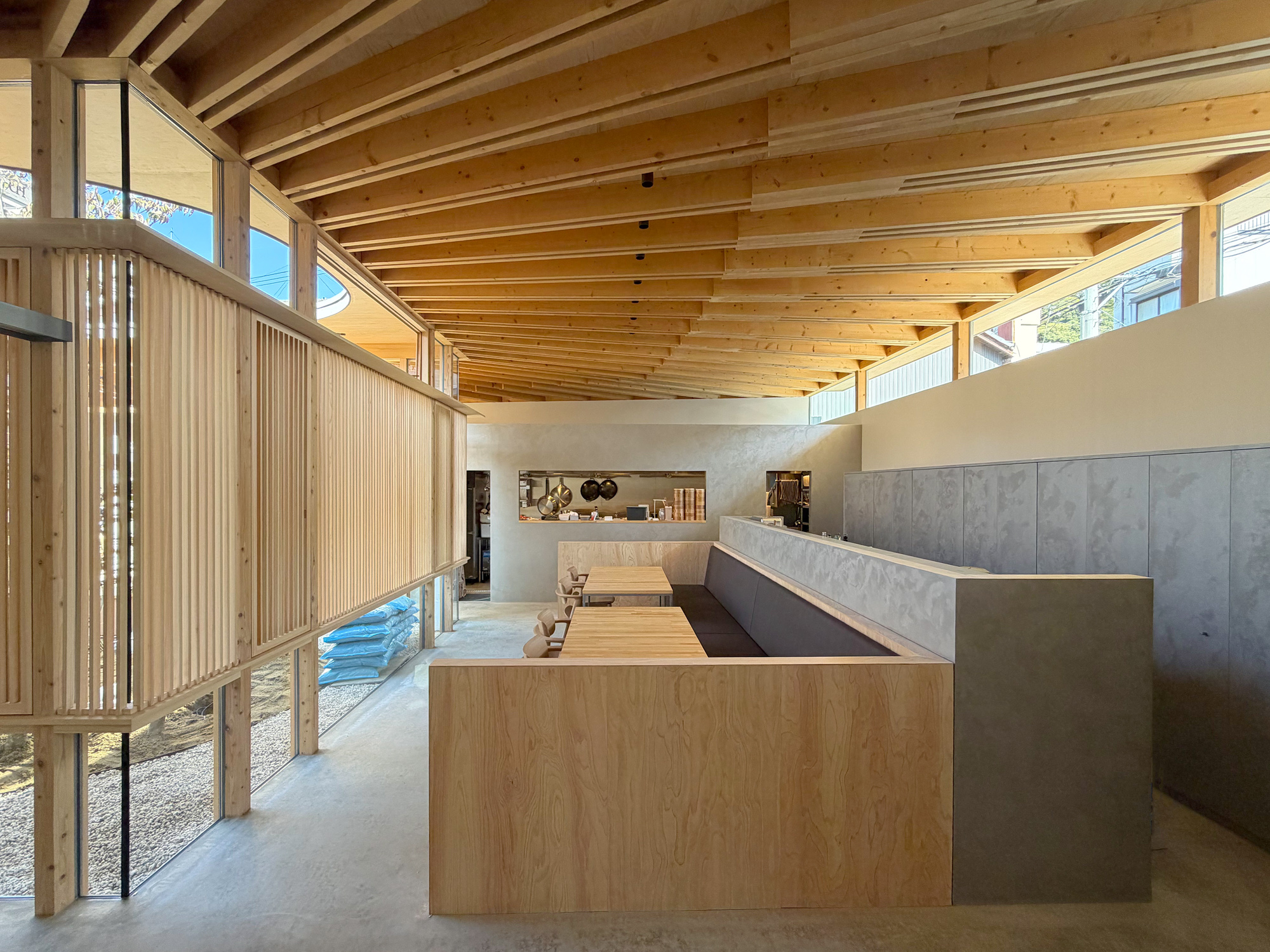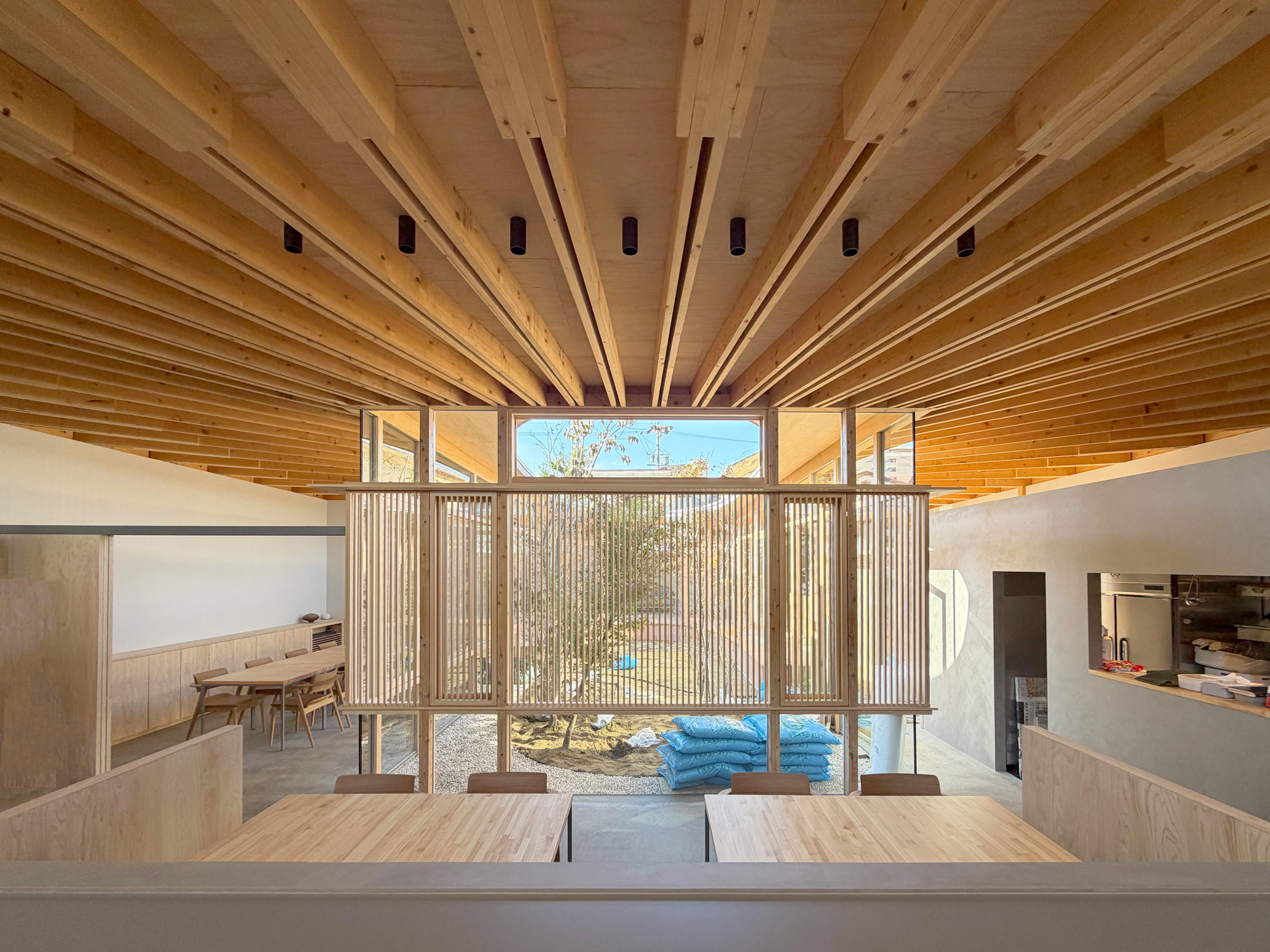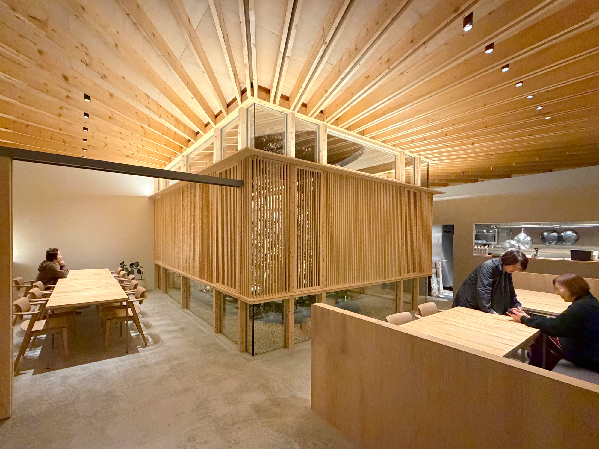 そこで、店舗の客席、厨房、食材庫から住宅のキッチン、ダイニング、リビング、寝室までを、各エリア間の視線を考慮しながら見通しよくリング状に並べ、職と住がゆるやかにつながるシームレスな空間をつくり出した。その上に放射状の梁を持つ木架構の屋根をのせ、どこにいても一体的に感じられるようにした。