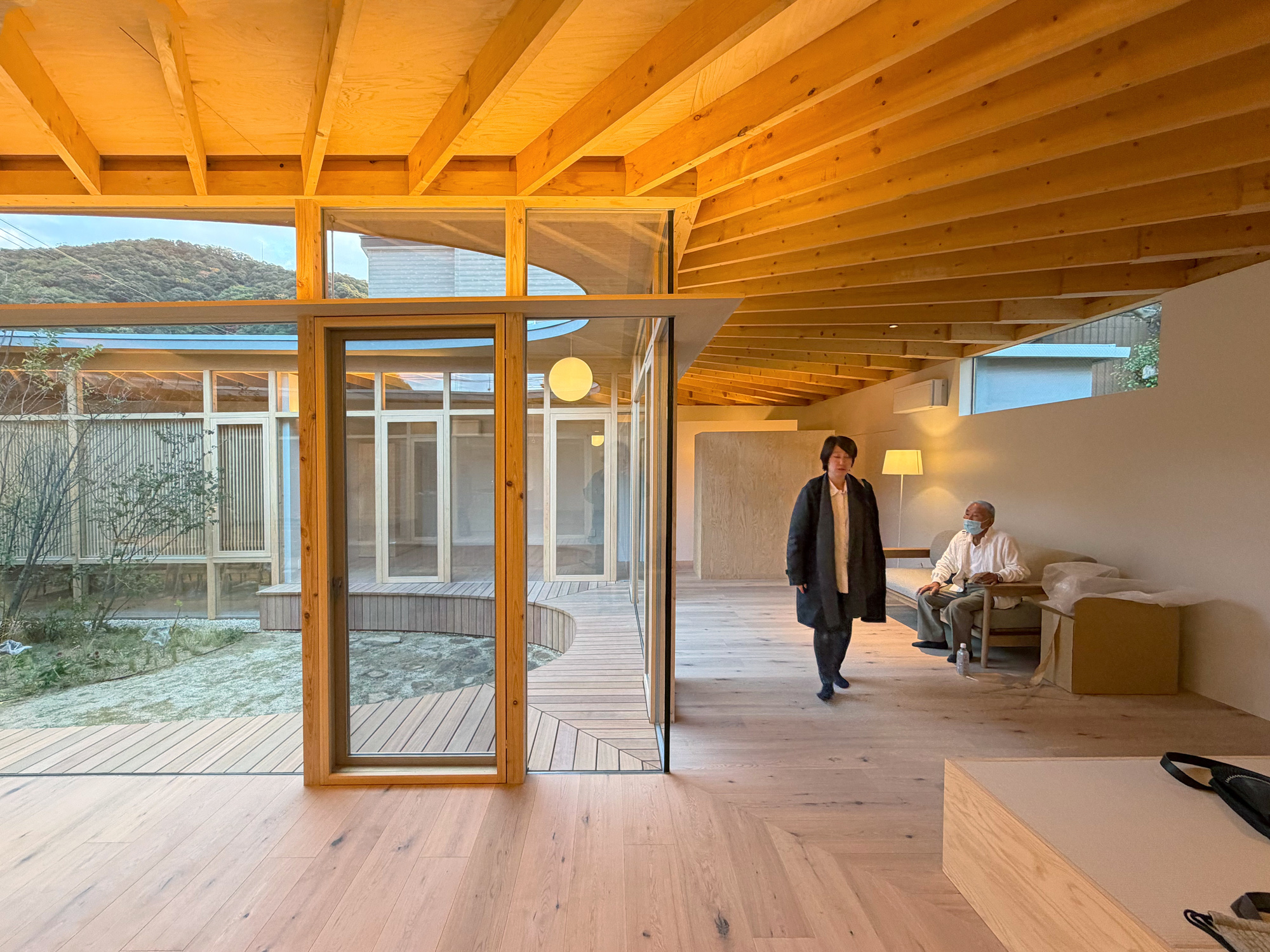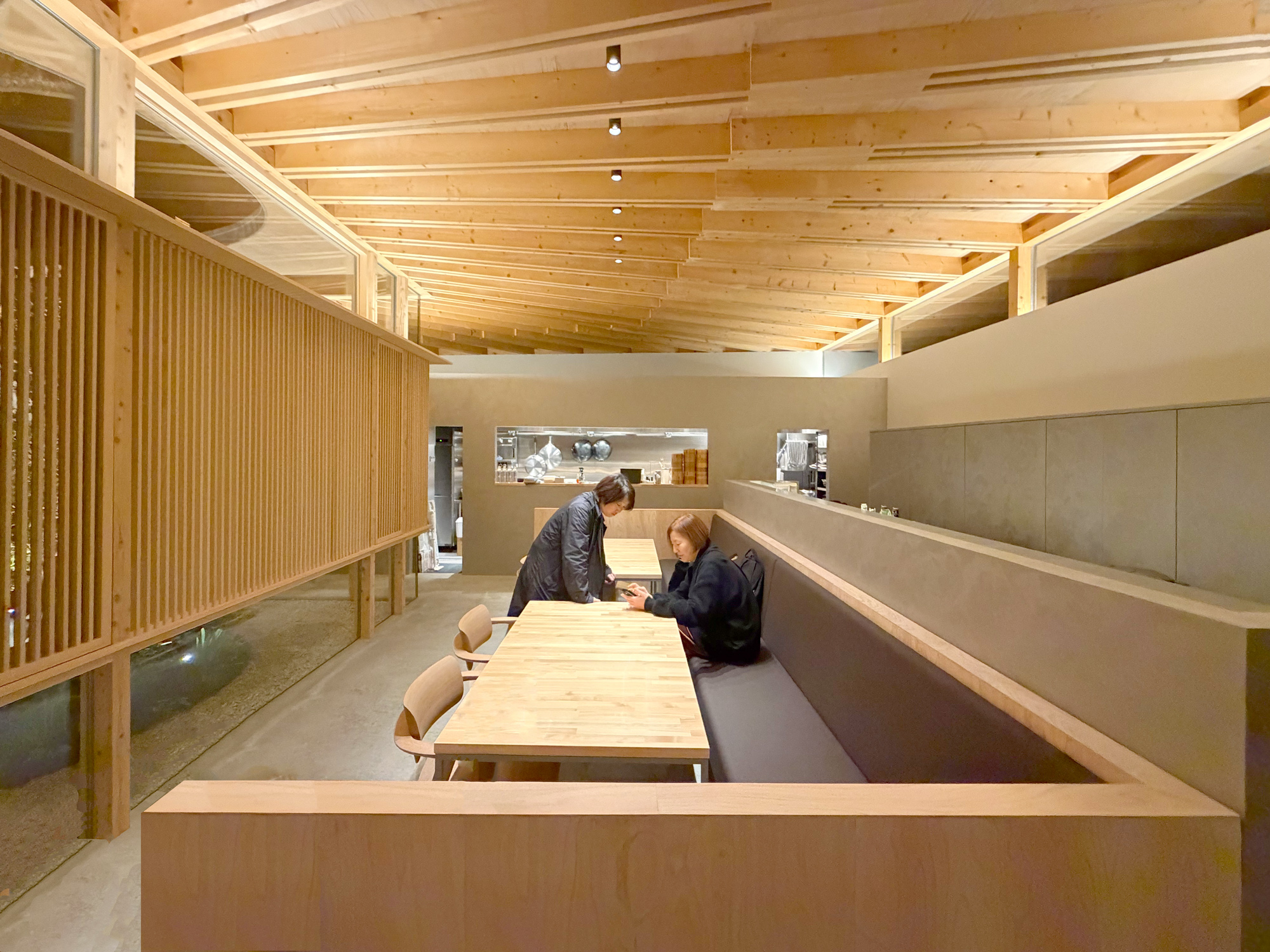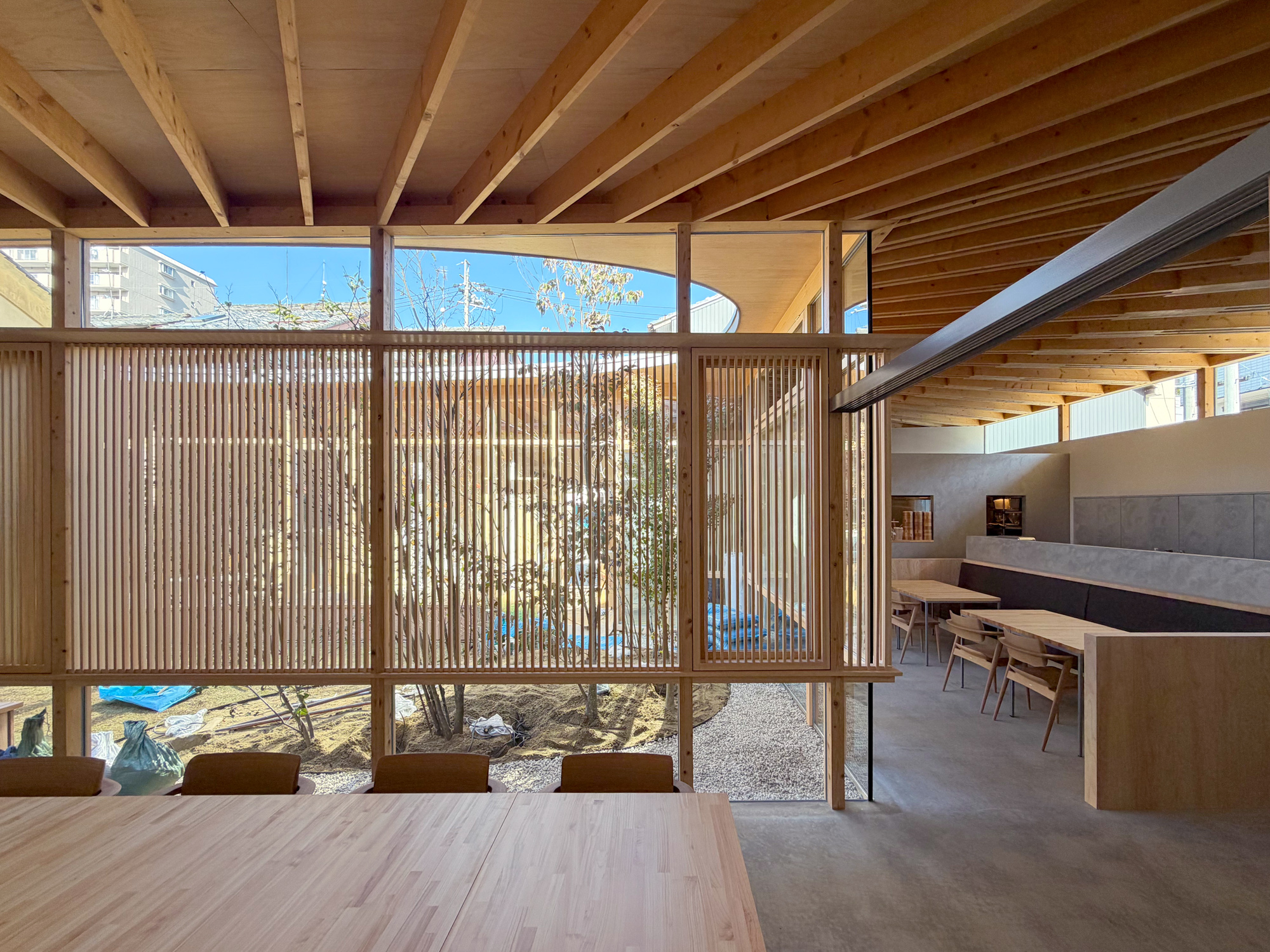 そこで、店舗の客席、厨房、食材庫から住宅のキッチン、ダイニング、リビング、寝室までを、各エリア間の視線を考慮しながら見通しよくリング状に並べ、職と住がゆるやかにつながるシームレスな空間をつくり出した。その上に放射状の梁を持つ木架構の屋根をのせ、どこにいても一体的に感じられるようにした。