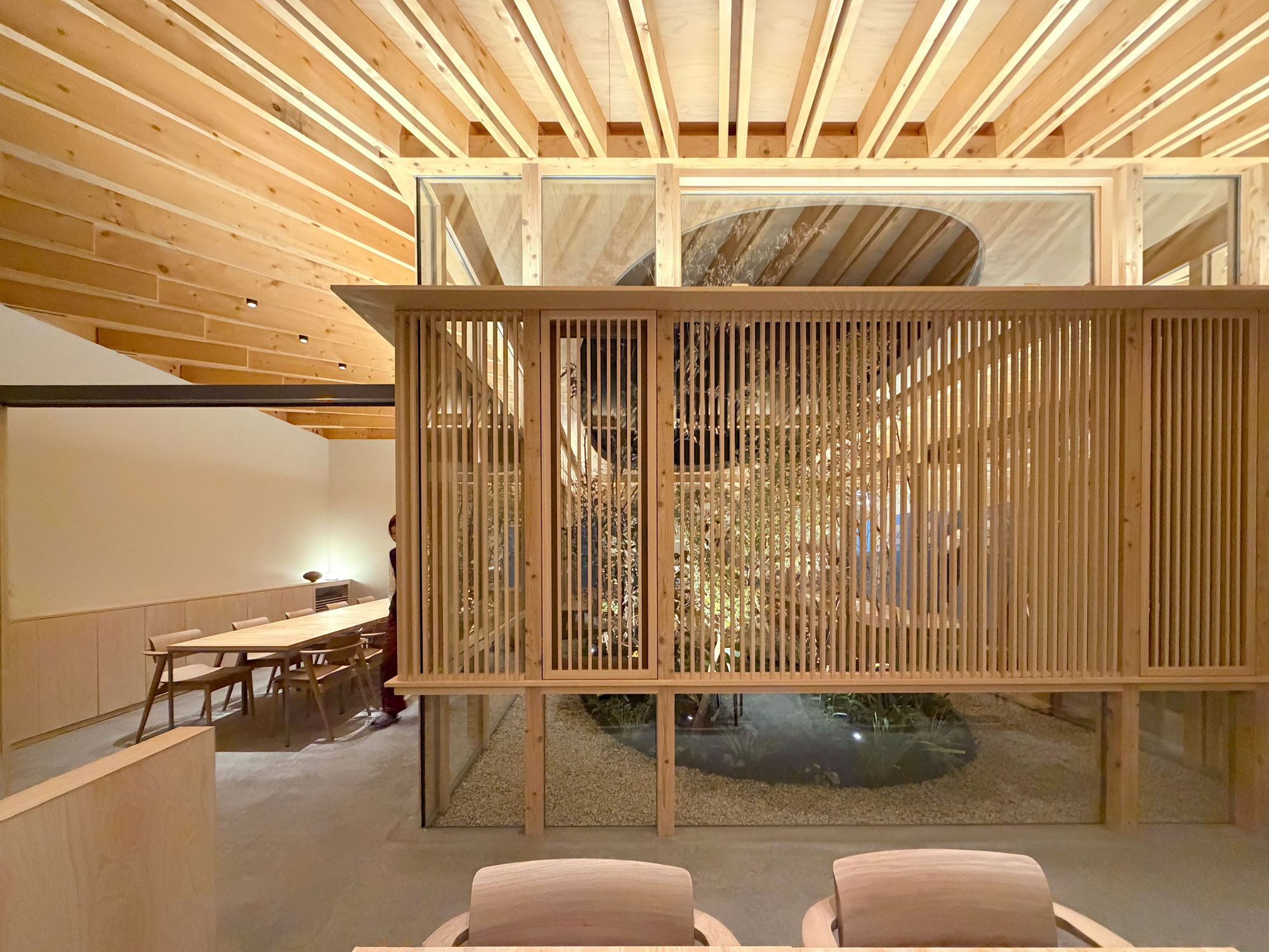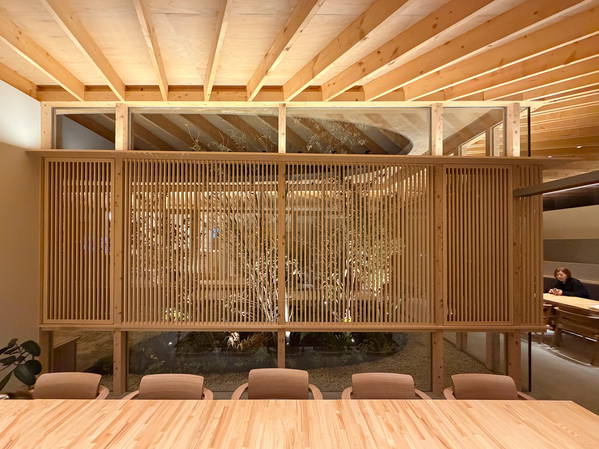 中庭を介してお互いのエリアを中距離に感じられる。ルーバーや植栽を用いて視界を整え、金華山から続く山並みを借景とすることで壮大な広がりも生み出した。