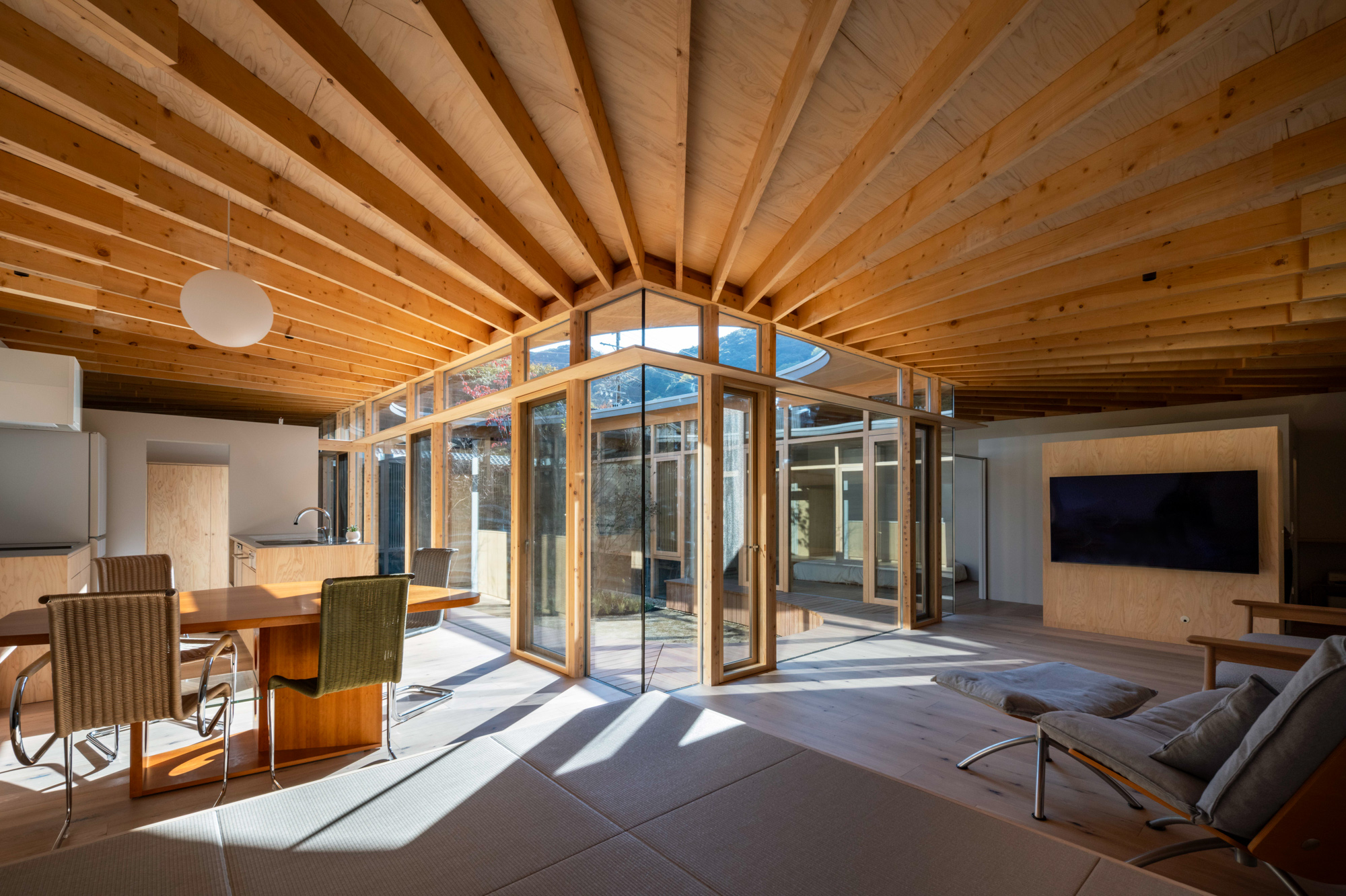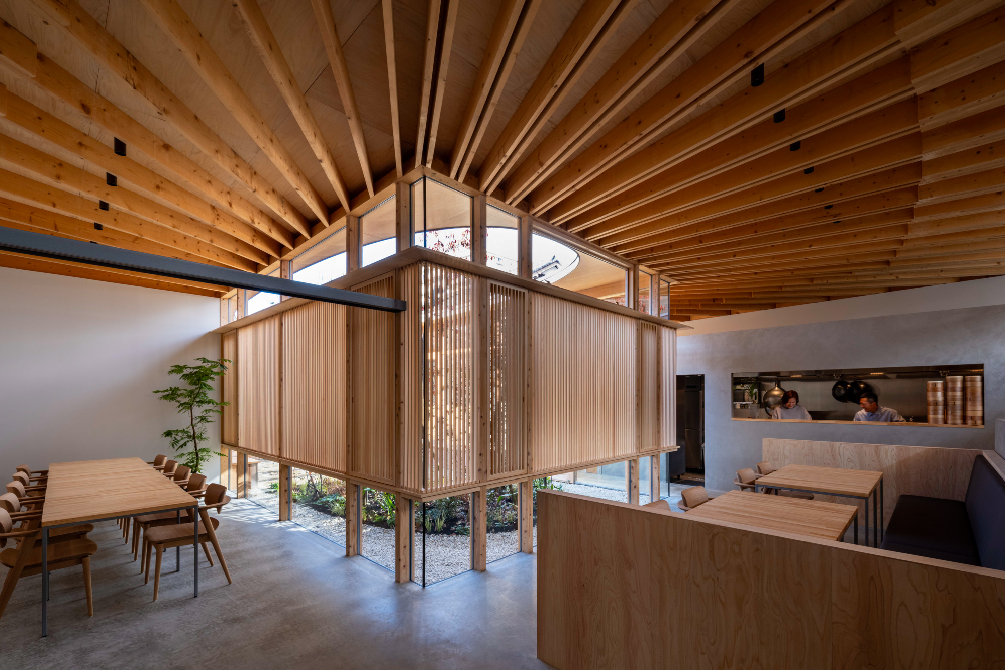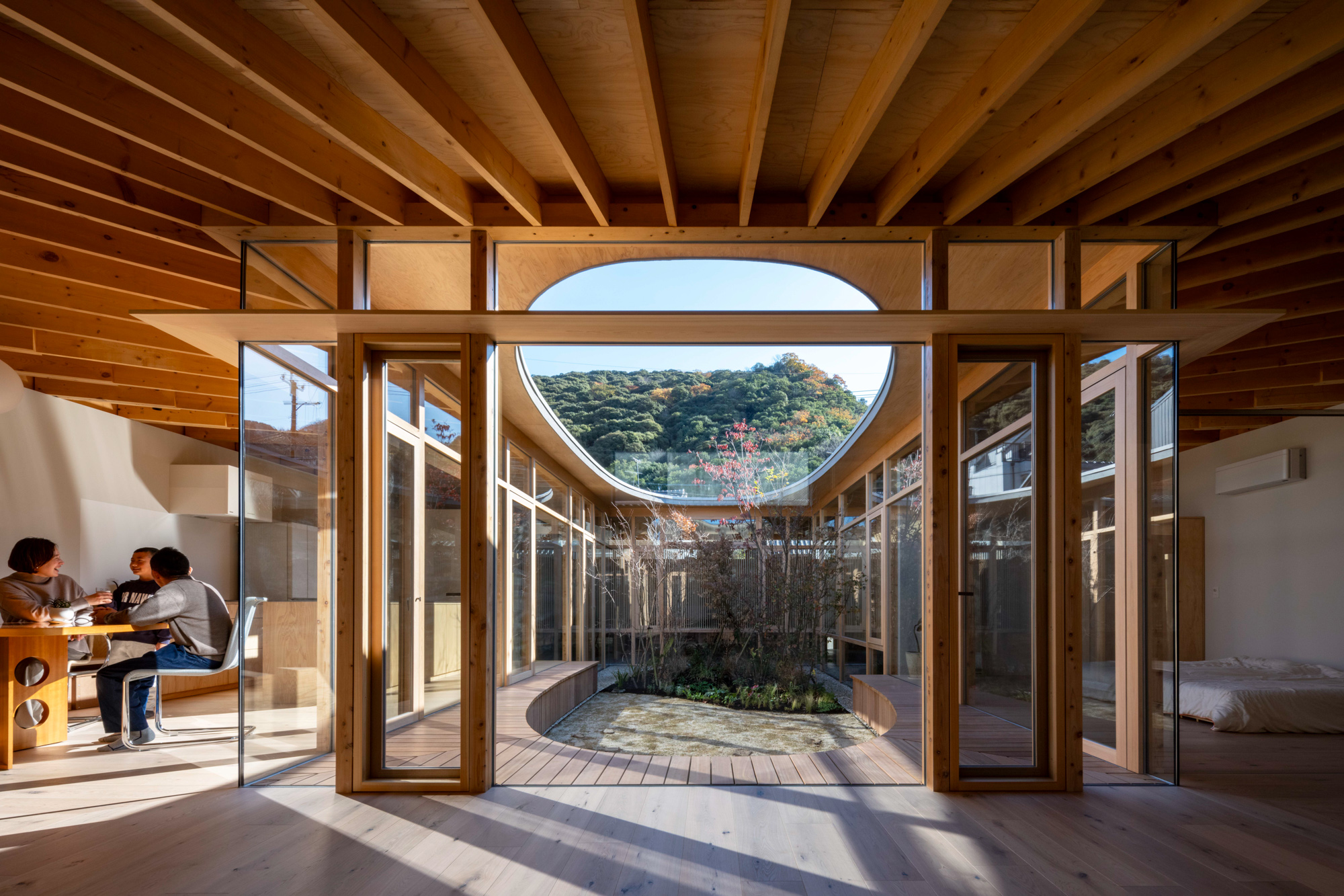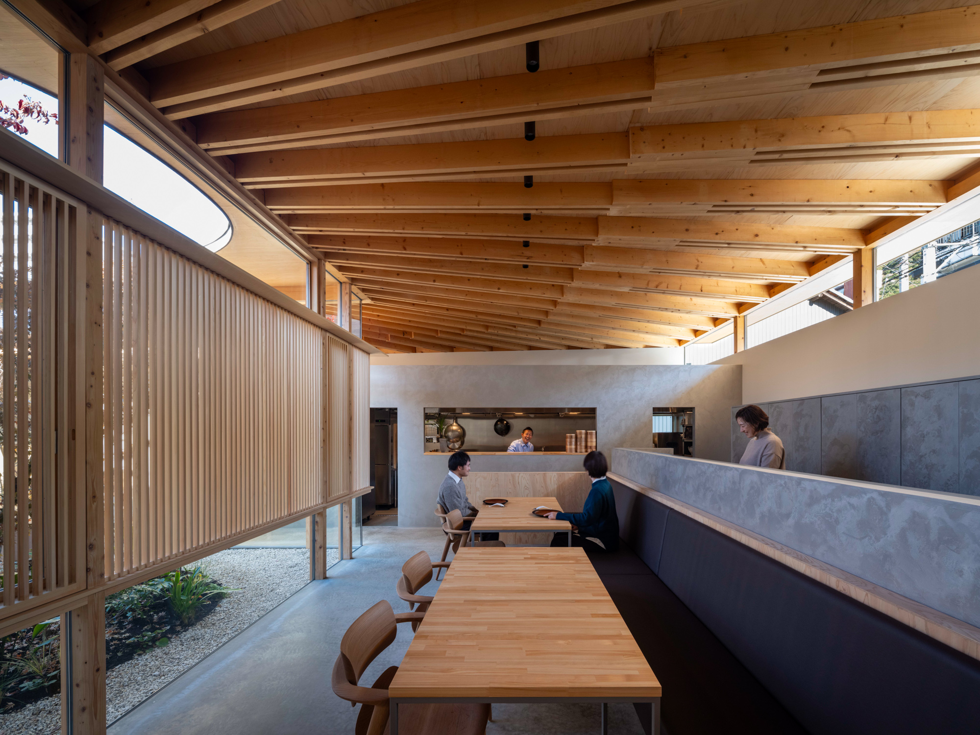 そこで、店舗の客席、厨房、食材庫から住宅のキッチン、ダイニング、リビング、寝室までを、各エリア間の視線を考慮しながら見通しよくリング状に並べ、職と住がゆるやかにつながるシームレスな空間をつくり出した。その上に放射状の梁を持つ木架構の屋根をのせ、どこにいても一体的に感じられるようにした。