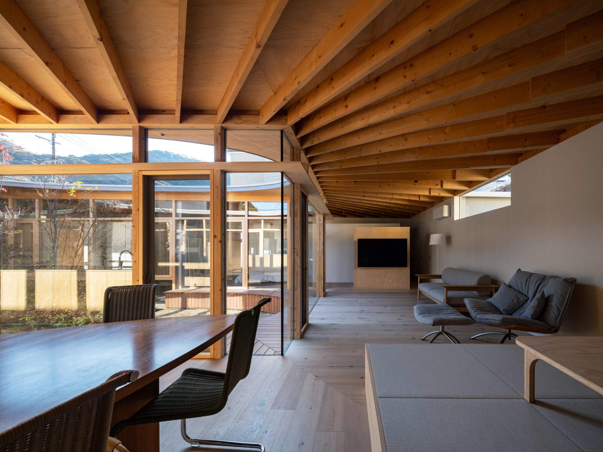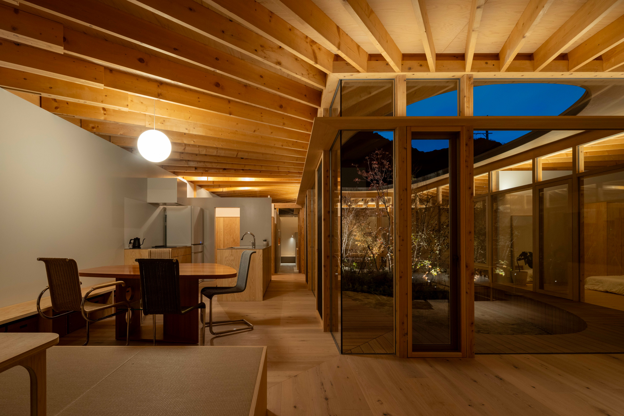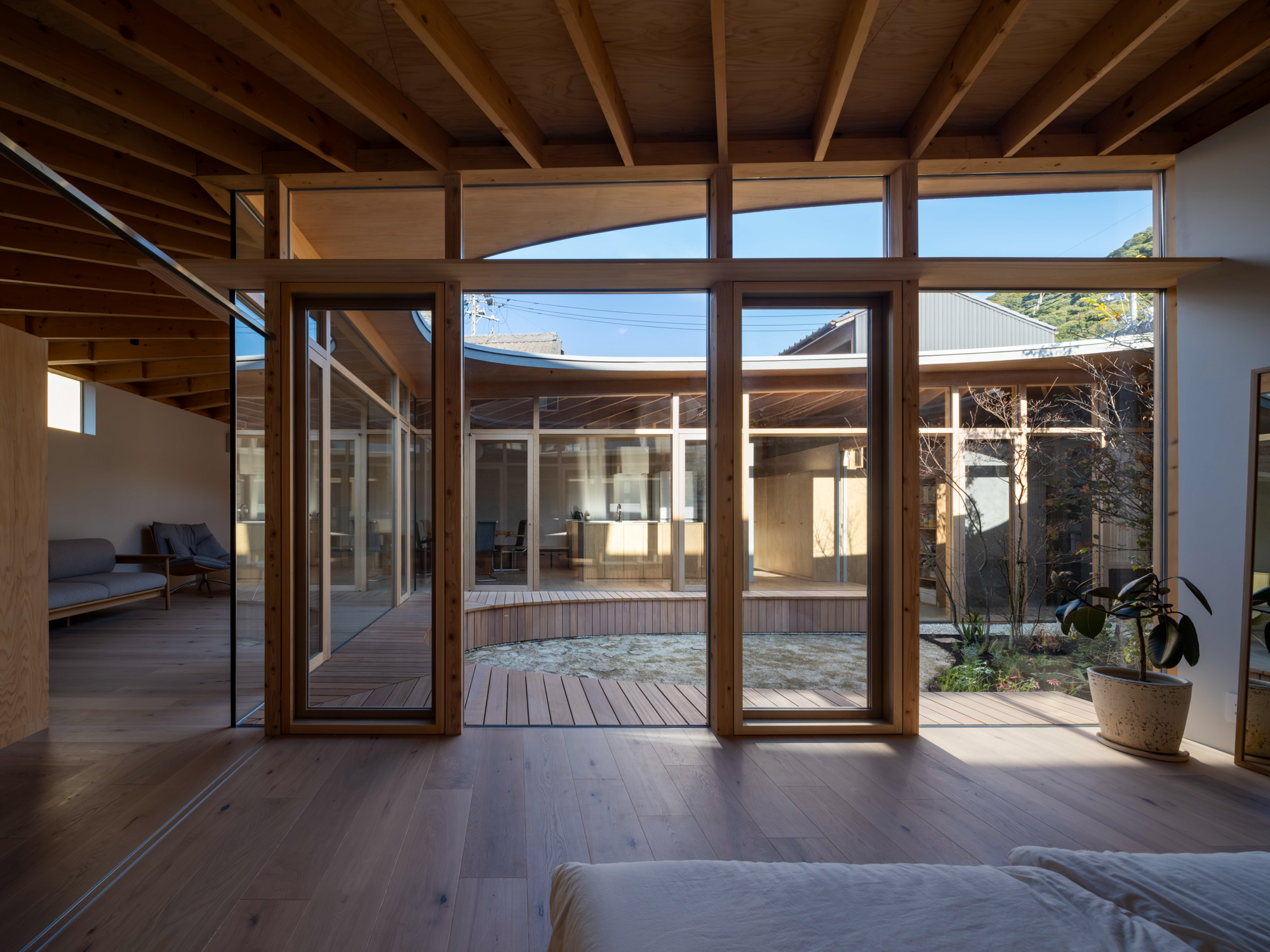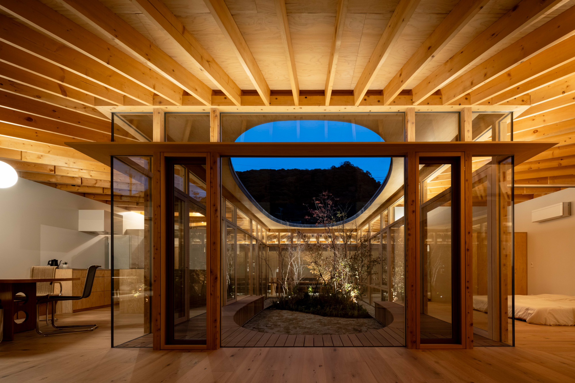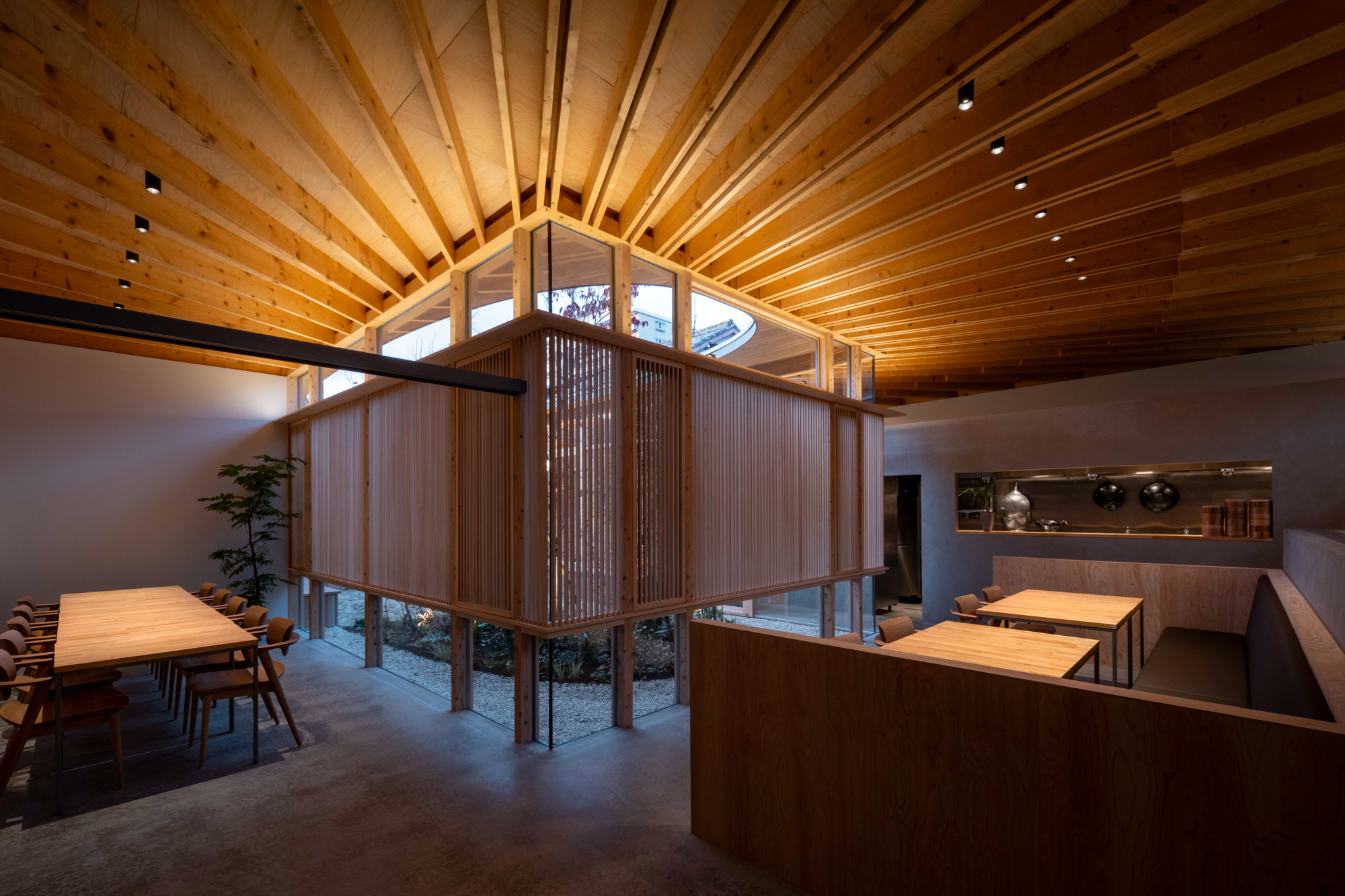 そこで、店舗の客席、厨房、食材庫から住宅のキッチン、ダイニング、リビング、寝室までを、各エリア間の視線を考慮しながら見通しよくリング状に並べ、職と住がゆるやかにつながるシームレスな空間をつくり出した。その上に放射状の梁を持つ木架構の屋根をのせ、どこにいても一体的に感じられるようにした。