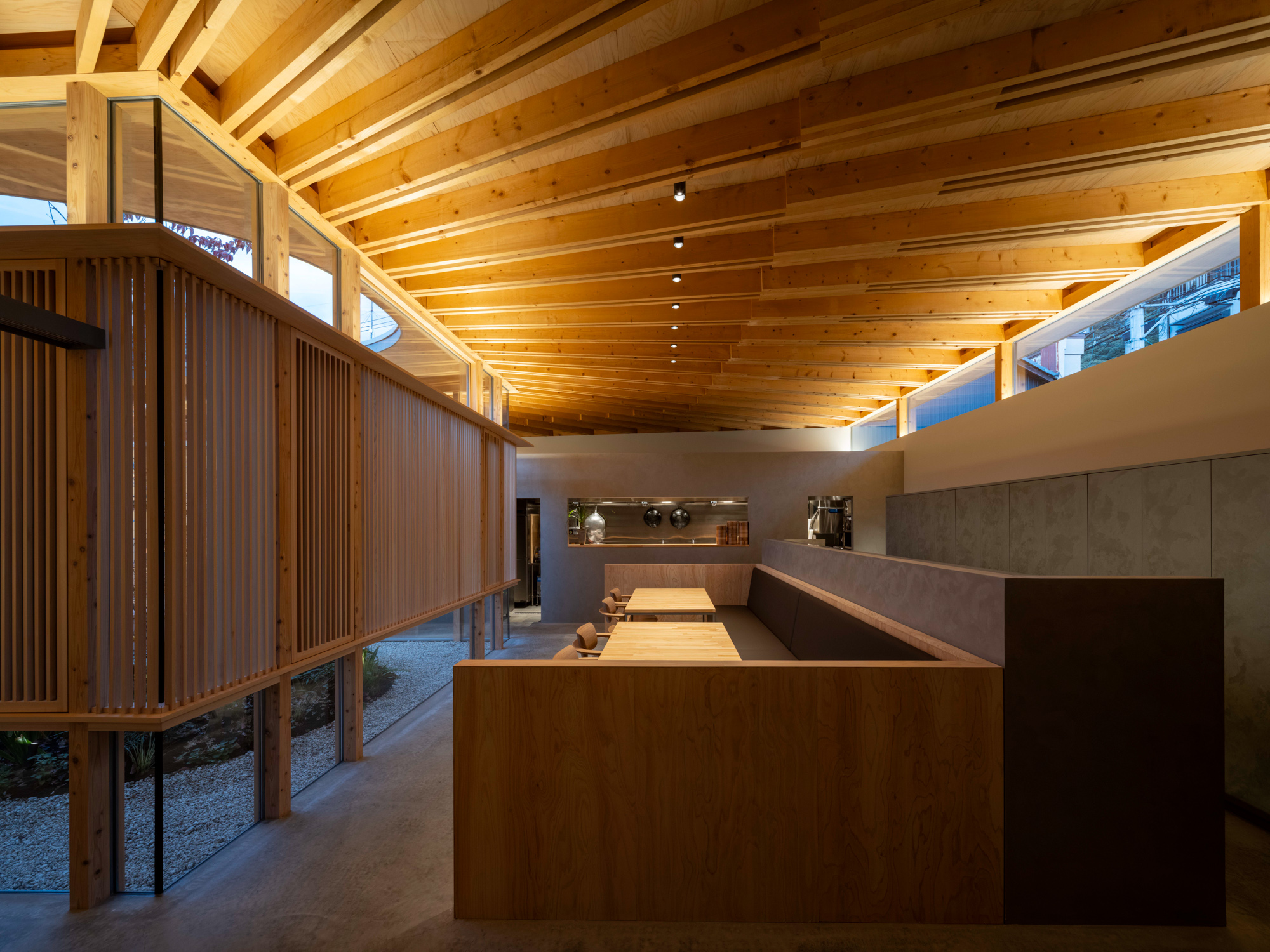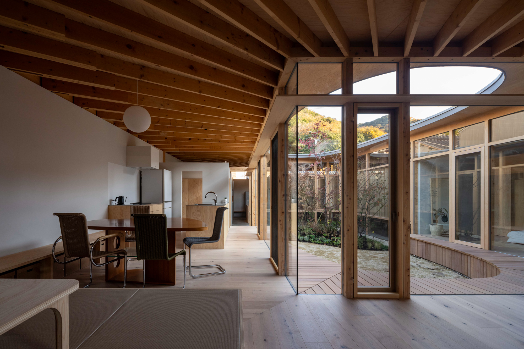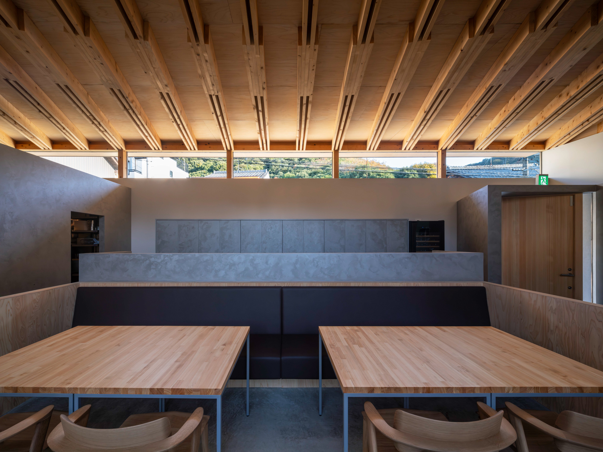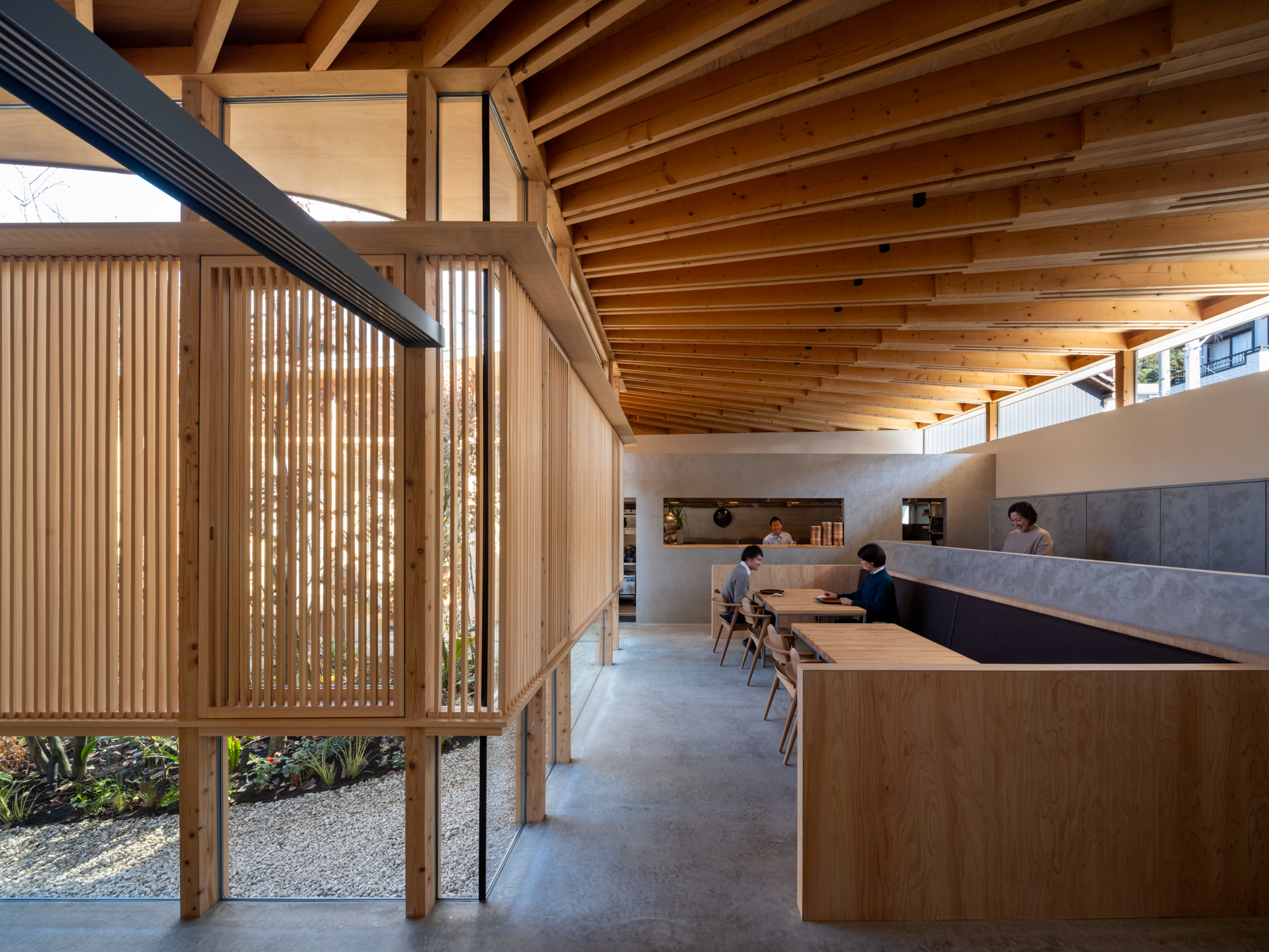 そこで、店舗の客席、厨房、食材庫から住宅のキッチン、ダイニング、リビング、寝室までを、各エリア間の視線を考慮しながら見通しよくリング状に並べ、職と住がゆるやかにつながるシームレスな空間をつくり出した。その上に放射状の梁を持つ木架構の屋根をのせ、どこにいても一体的に感じられるようにした。