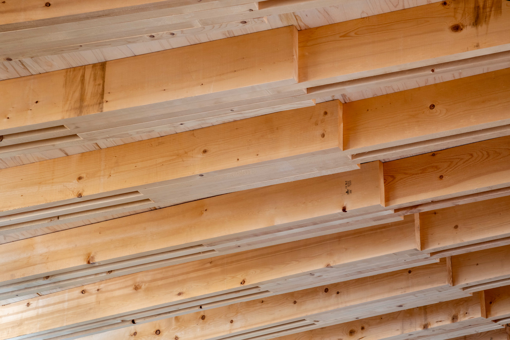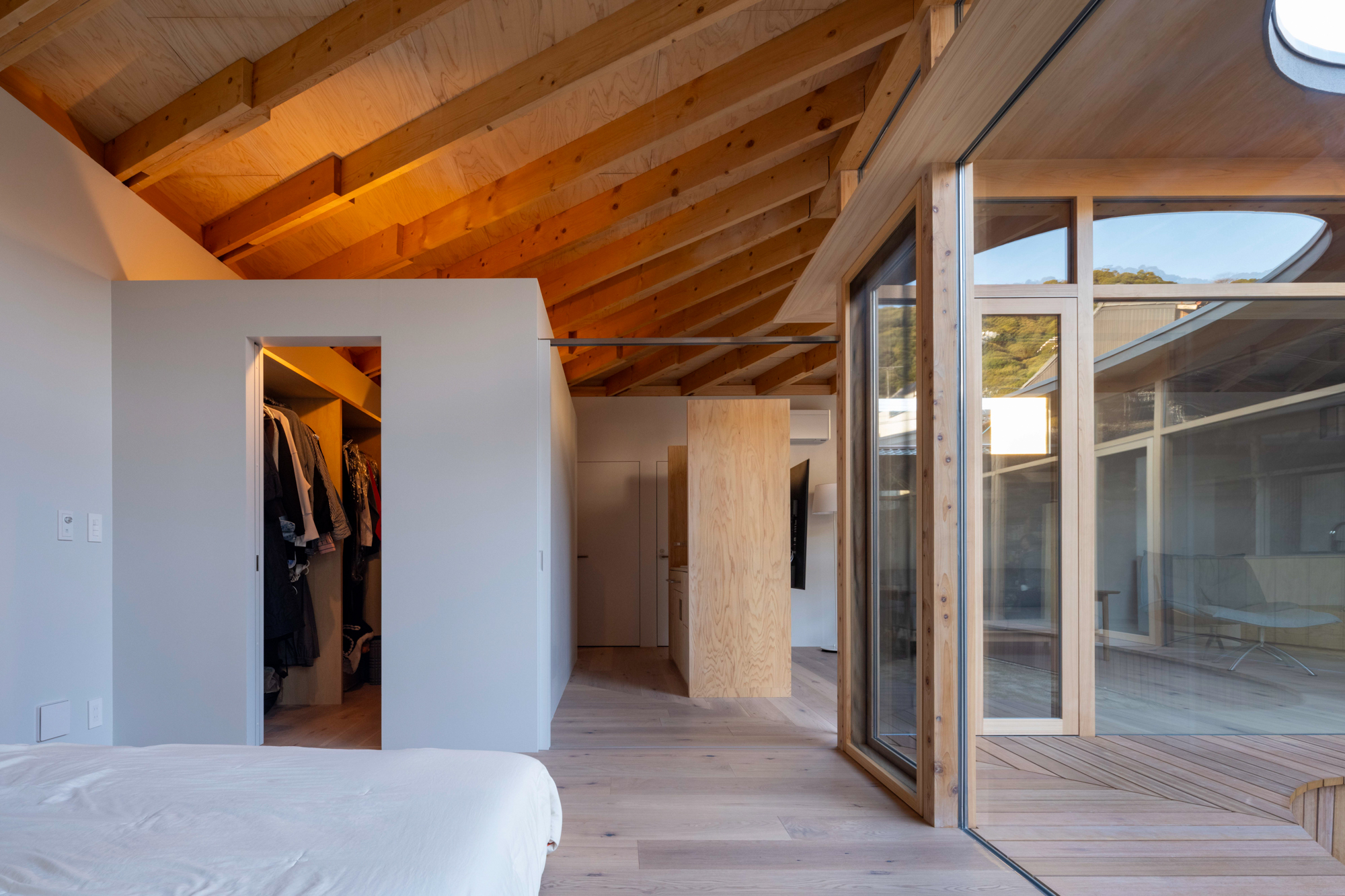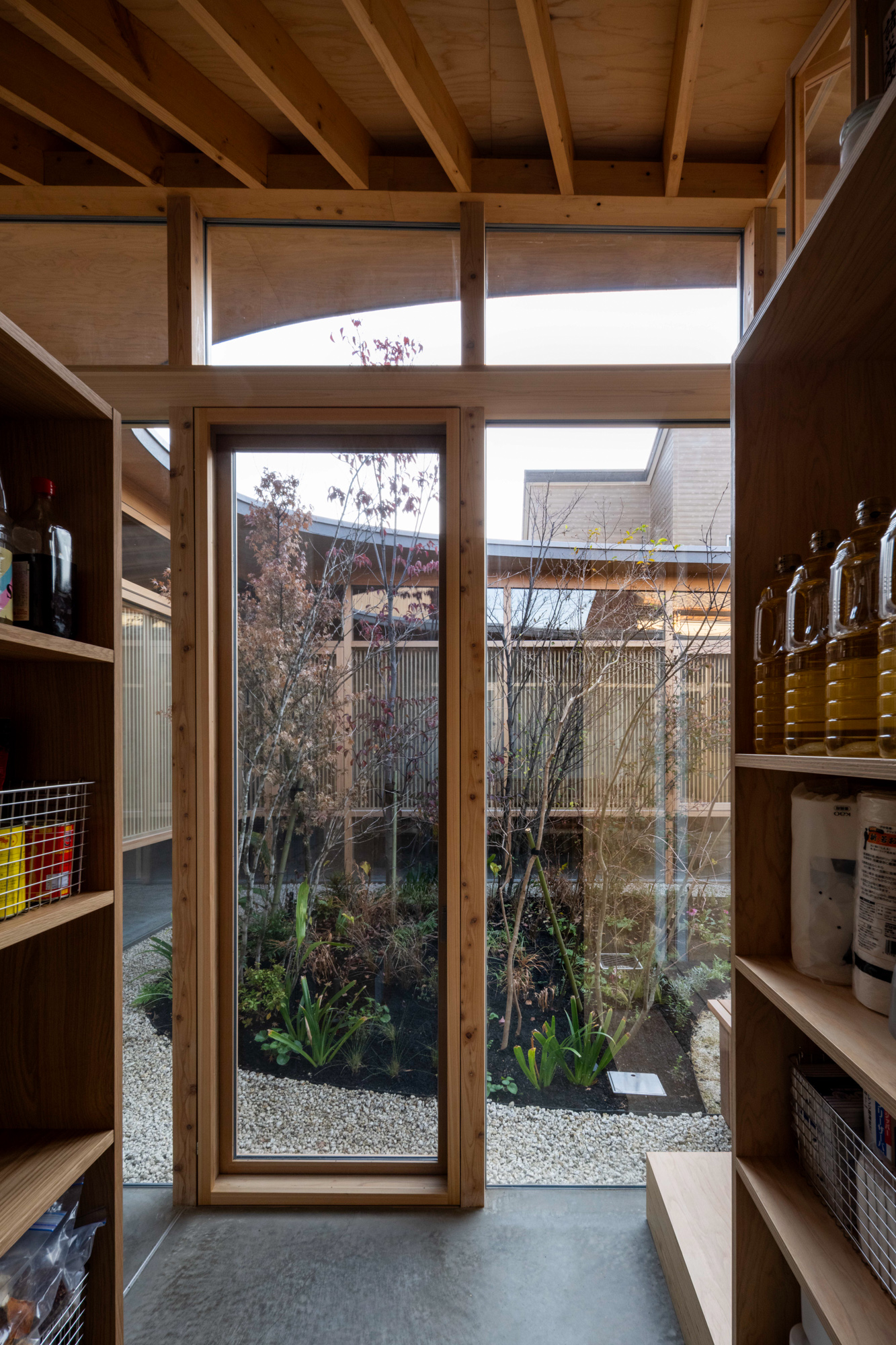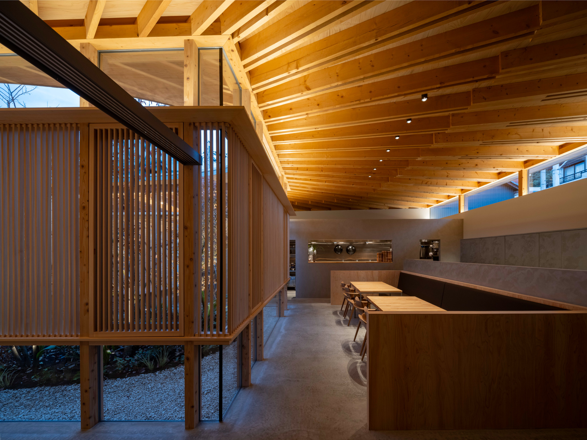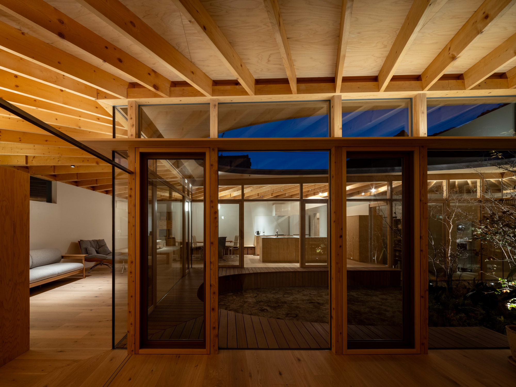 そこで、店舗の客席、厨房、食材庫から住宅のキッチン、ダイニング、リビング、寝室までを、各エリア間の視線を考慮しながら見通しよくリング状に並べ、職と住がゆるやかにつながるシームレスな空間をつくり出した。その上に放射状の梁を持つ木架構の屋根をのせ、どこにいても一体的に感じられるようにした。
