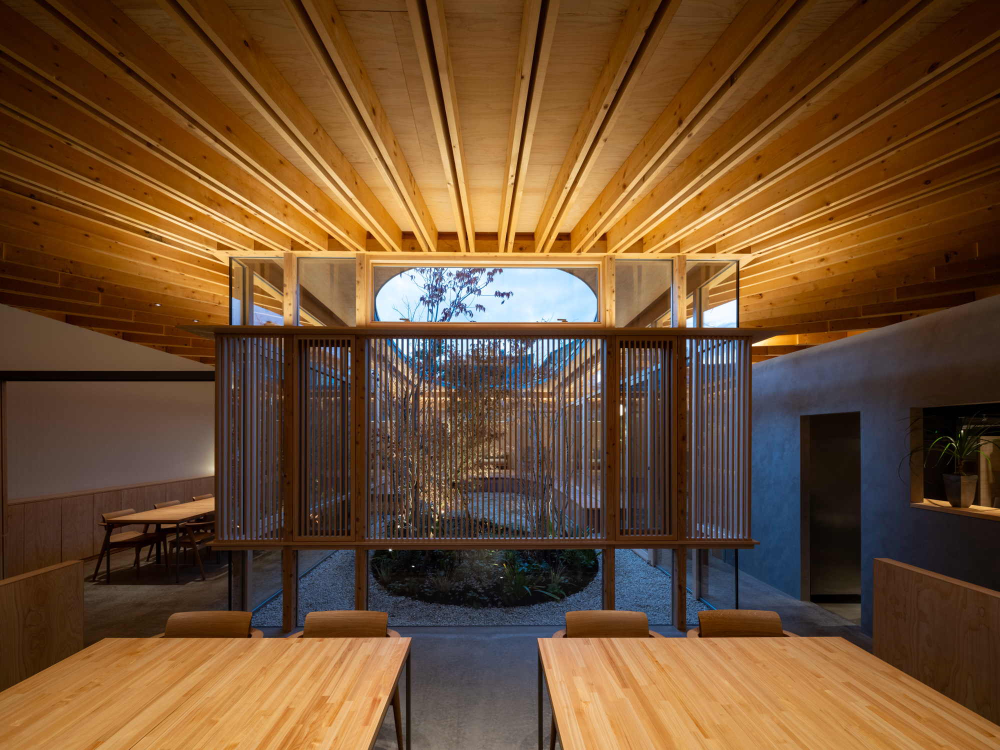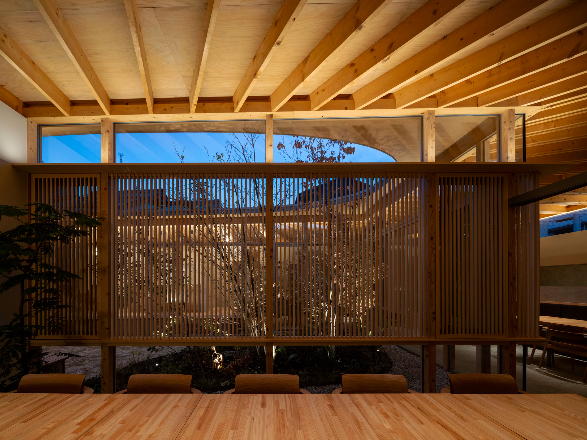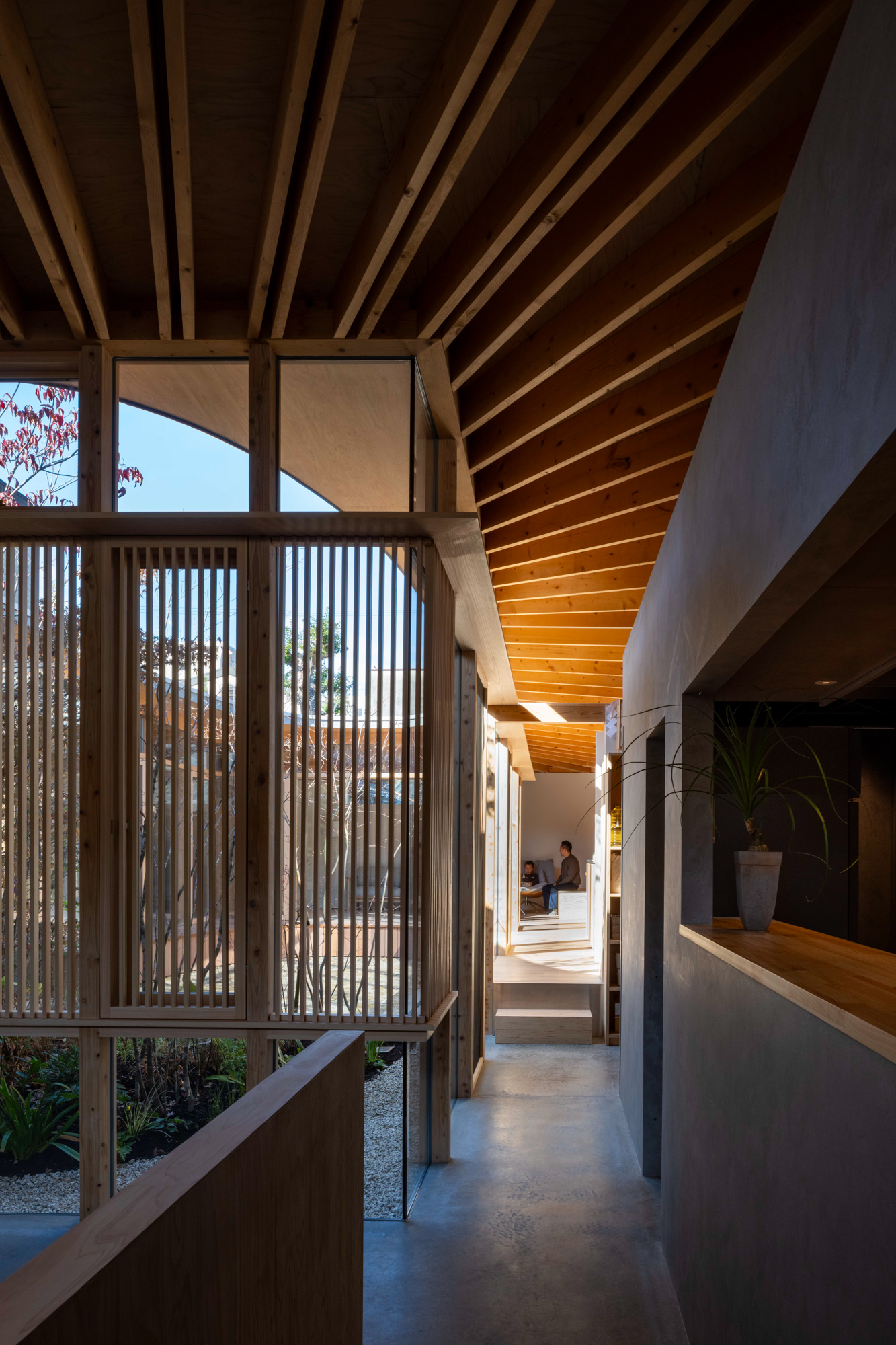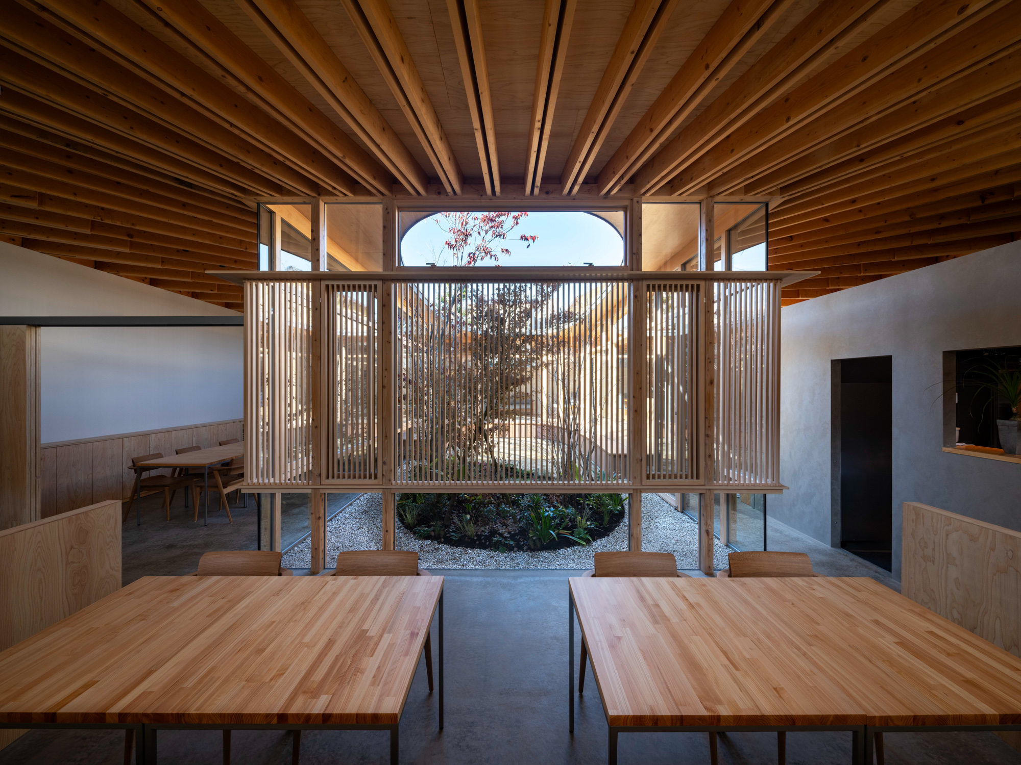 中庭を介してお互いのエリアを中距離に感じられる。ルーバーや植栽を用いて視界を整え、金華山から続く山並みを借景とすることで壮大な広がりも生み出した。