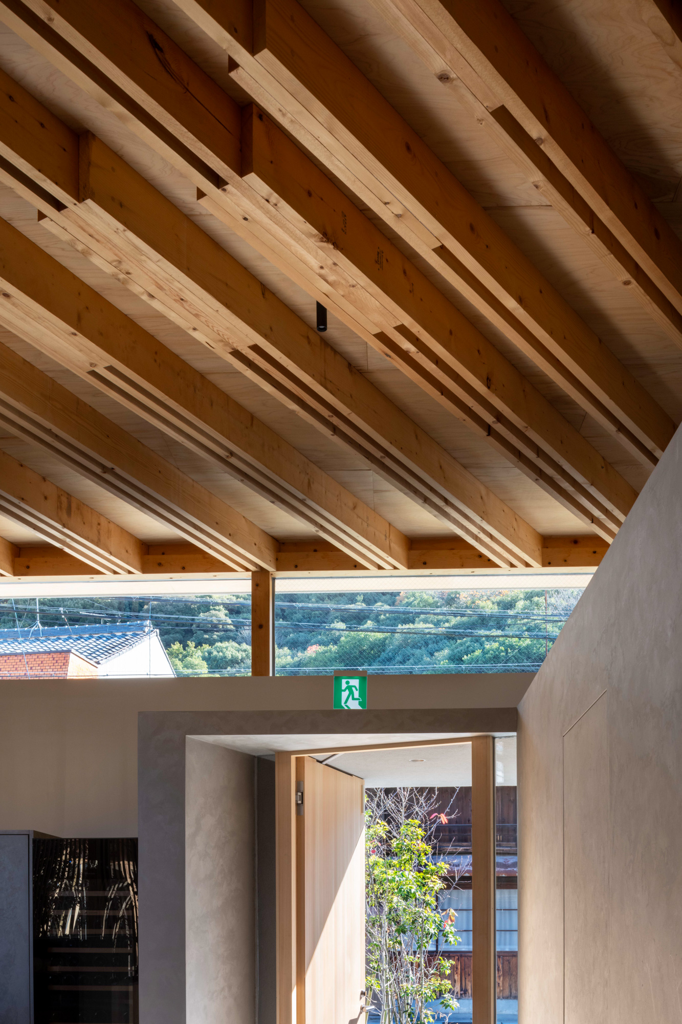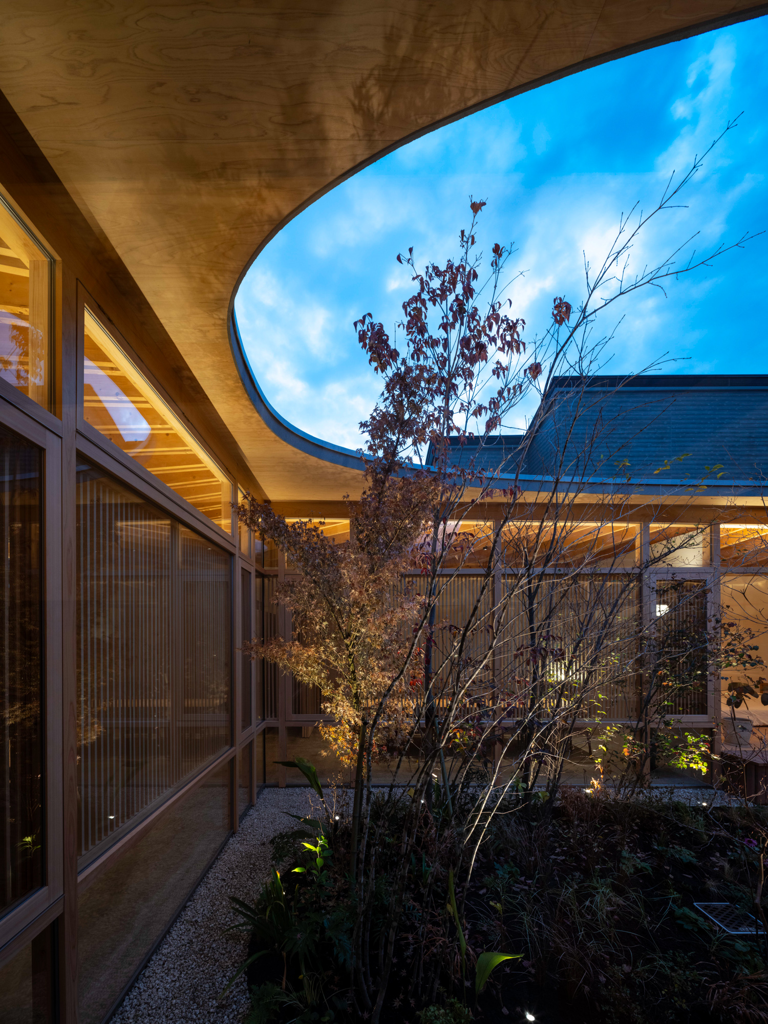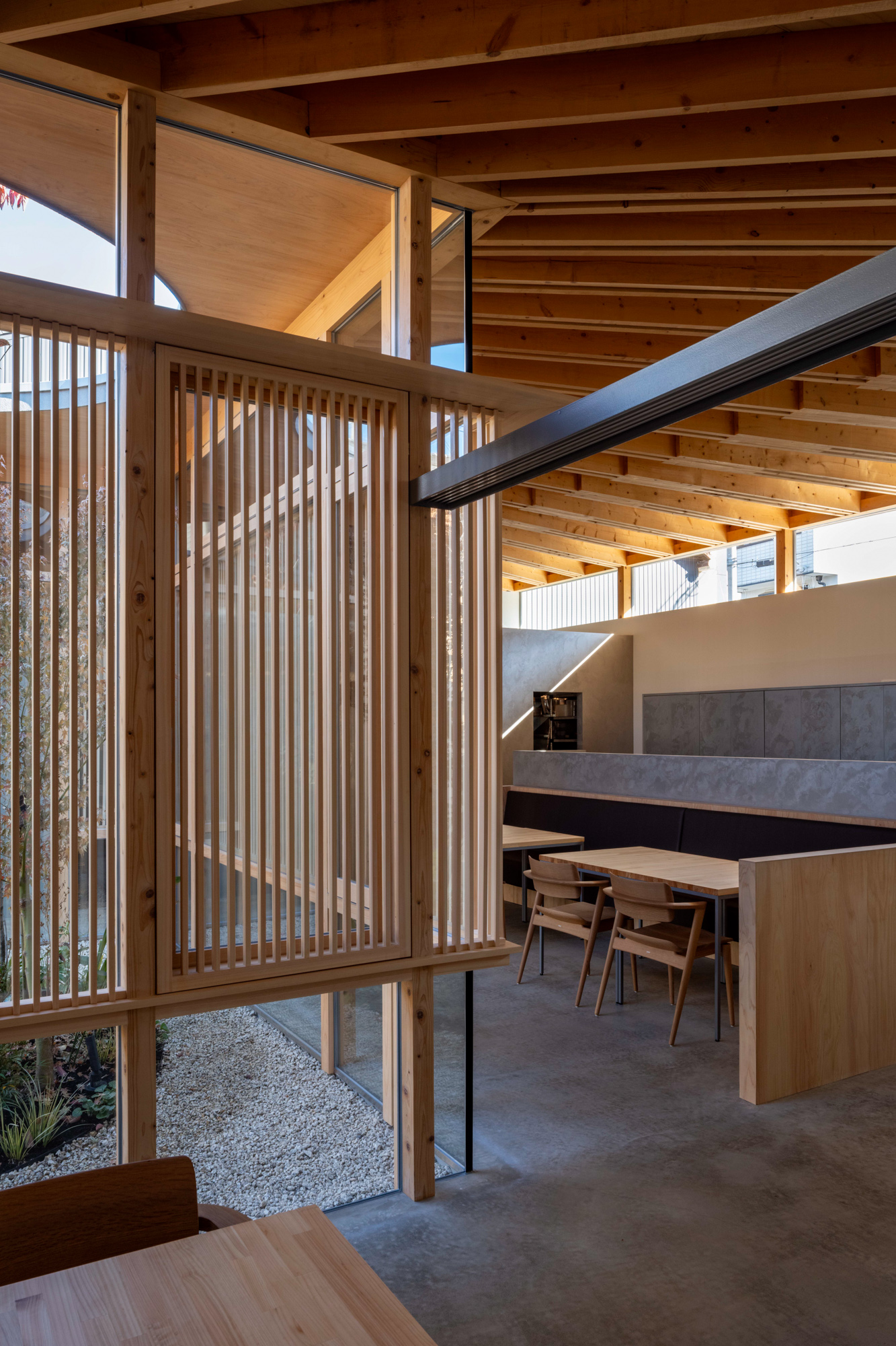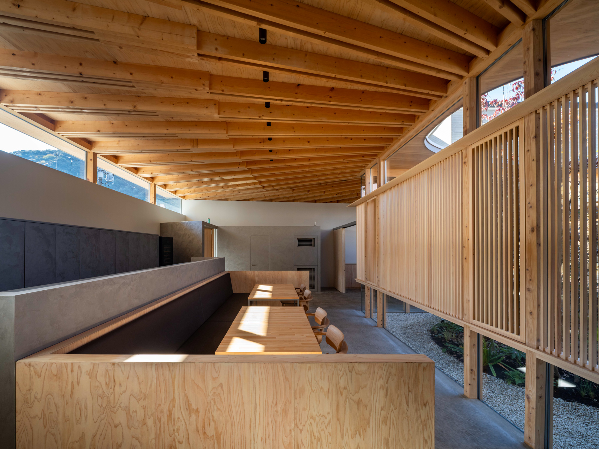 中庭を介してお互いのエリアを中距離に感じられる。ルーバーや植栽を用いて視界を整え、金華山から続く山並みを借景とすることで壮大な広がりも生み出した。