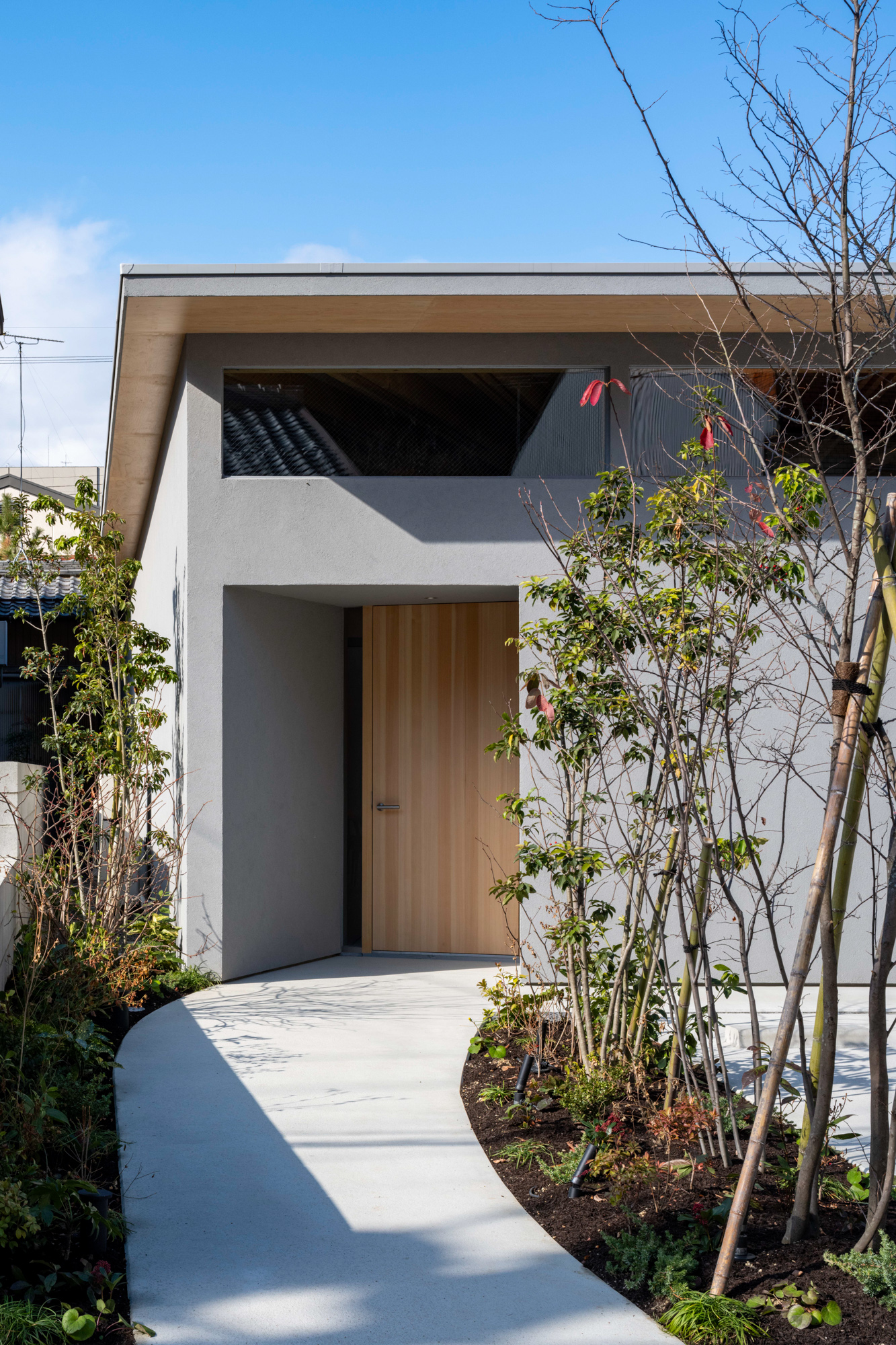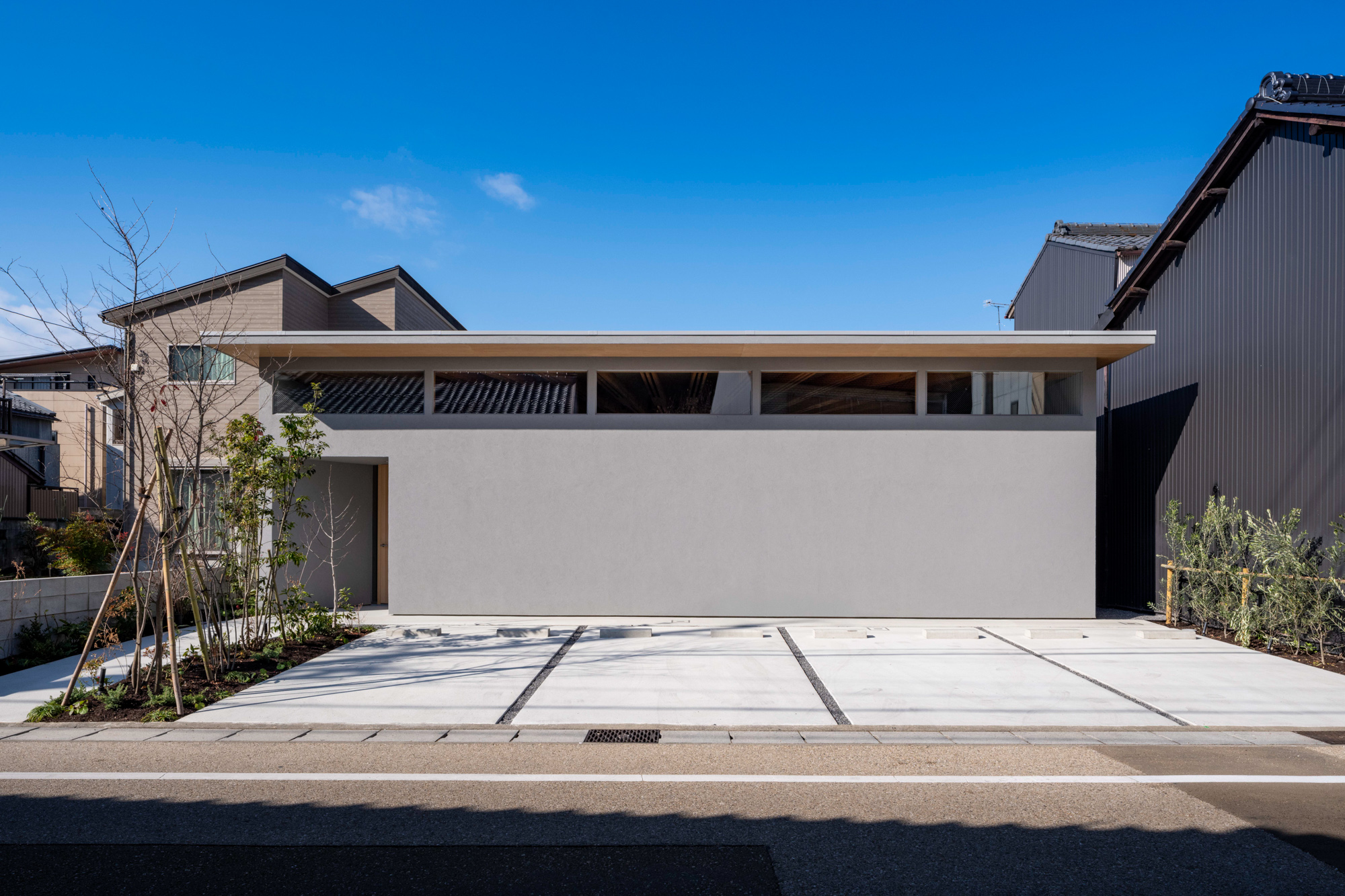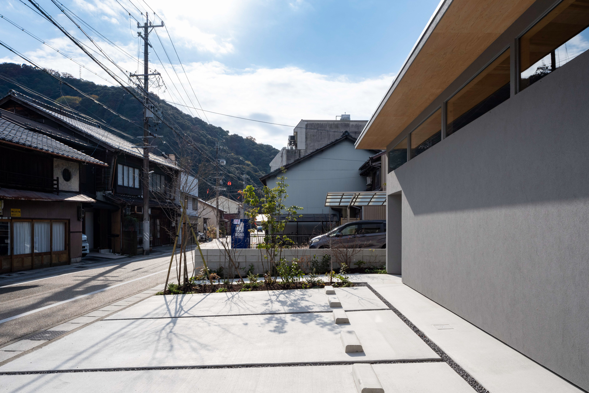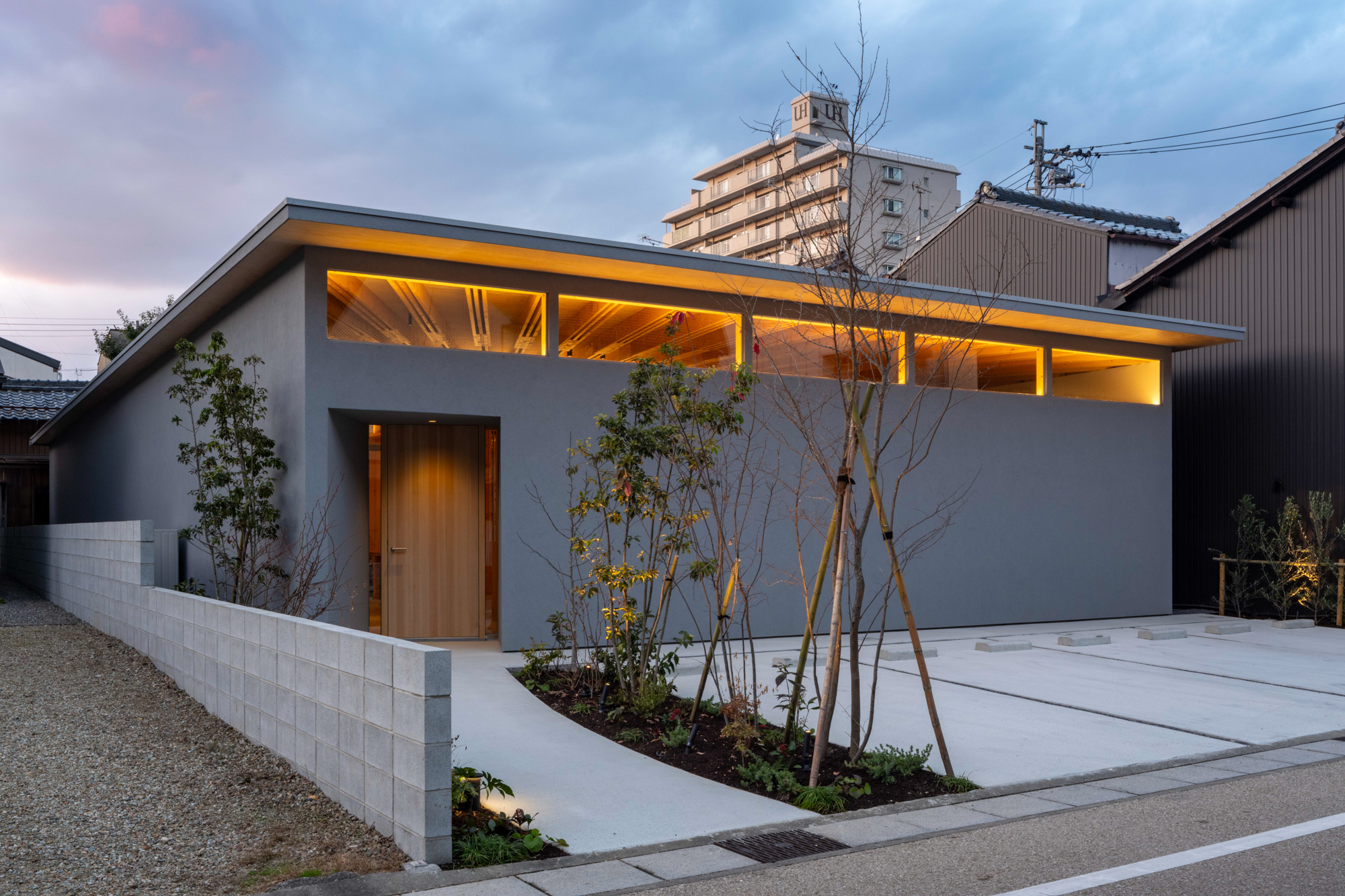 岐阜市内で有名な中華料理店の移転と、それを営む夫婦+子供1人が暮らす店舗兼用住宅である。地元で最も長い歴史を持つ伊奈波神社のほど近く、古い町家がまだ多く残る通りに建つ。夜営業の店舗の為、来客が食事に集中できることはもちろん、その時間に小さな子供が安心して両親の存在を感じられる環境が求められた。